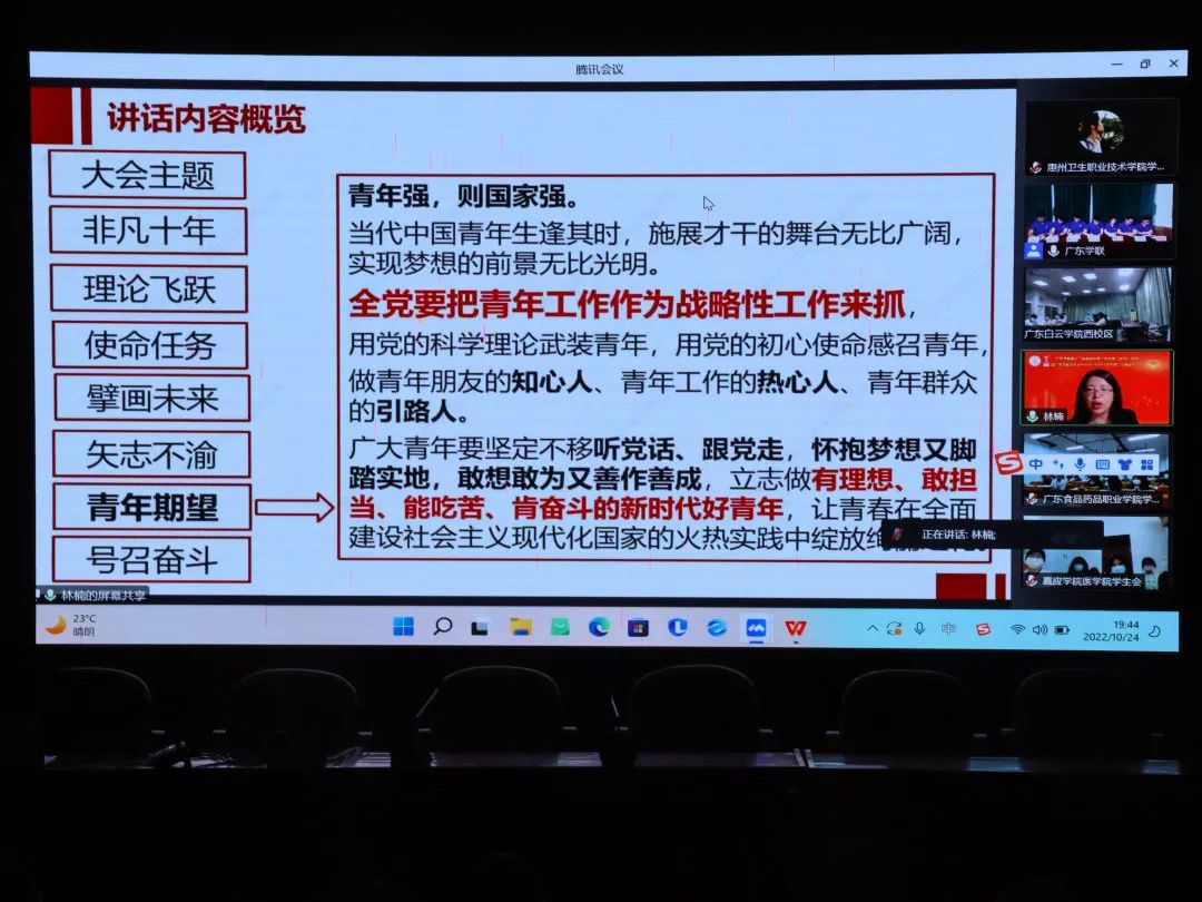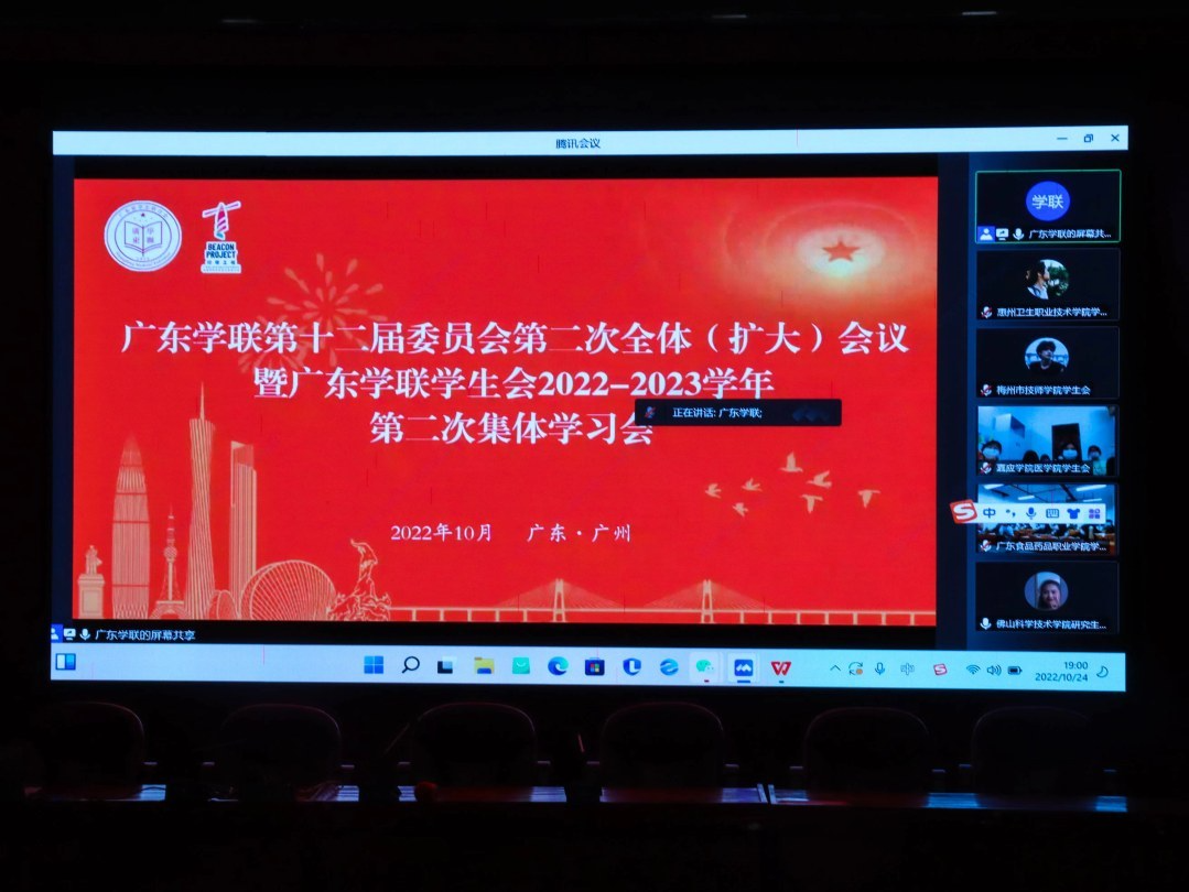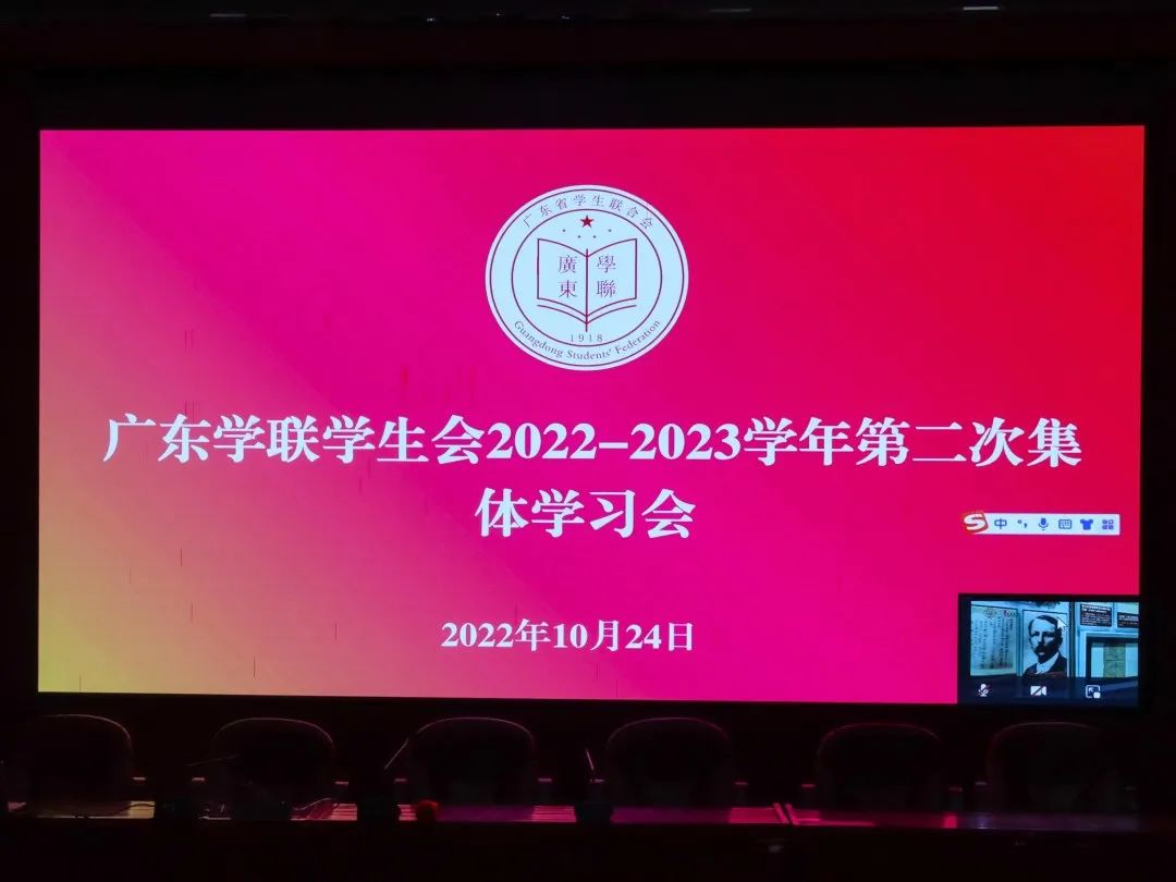 百年学联,青春奋进。请党放心,强国有我 。为了坚定理想信念 ,传承红色基因 。2202年10月24日19:00,由学生会代表参加广东学联学生会2022~2023年第二次集体学习会, 会议以线上形式展开。
