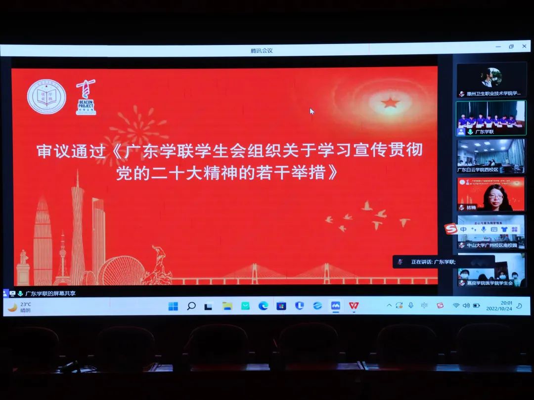 第三项议程:审议通过《广东省学联学生会组织关于学习宣传贯彻党的二十大精神的若干举措 》。该文件由广东学联十二届委员会成员团体联络群中投票获一致通过 。由广东省学联刘宗宇同学来介绍广东省学联学生会组织关于宣传惯例党的二十大精神的若干举措 。