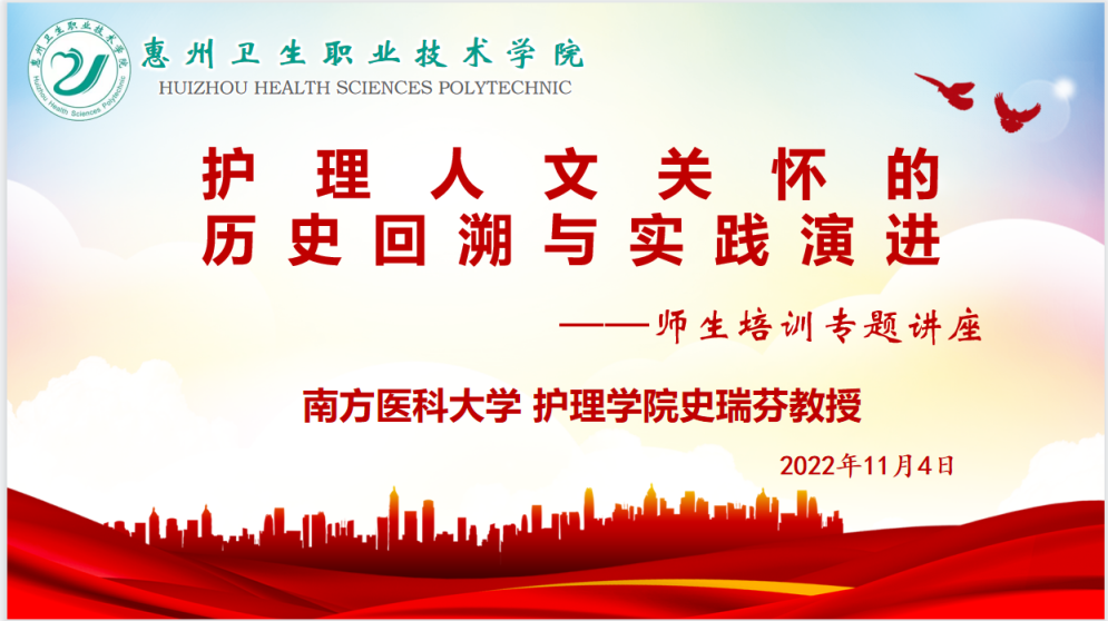 为提升我校护理人才的人文关怀意识,促进医护生职业素养提高,11月4日下午,以护理实训楼智慧养老实训中心为主会场、各班级教室为分会场,举行了护理人文关怀与沟通为主题的讲座。邀请国内知名专家南方医科大学史瑞芬教授作“护理人文关怀的历史回溯与实践演进”专题讲座。讲座由护理学院院长高丽玲主持,学院全体教师及在校班学生,共约2600余人聆听了本场讲座。