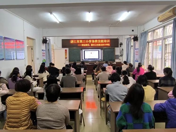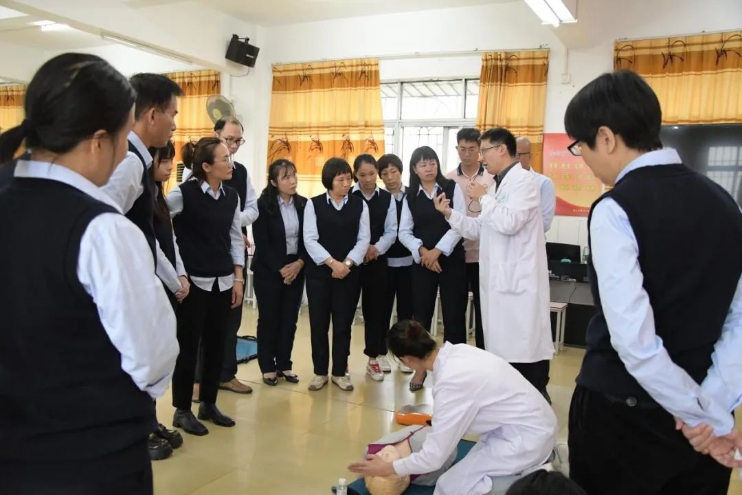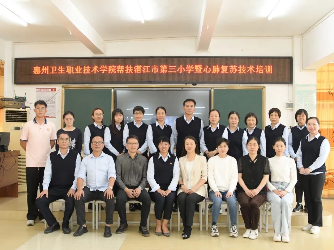 11月30日,护理学院院长高丽玲、学校学工部长余赟、护理学院副院长钟晓璇、外科教研室主任李文婷、学院团委书记陈裕玲一行5人前往湛江市第三小学进行结对帮扶交流活动。校学生工作部部长、外科教师余赟为参训教师详细讲解常用的急救技术并进行现场演示。
