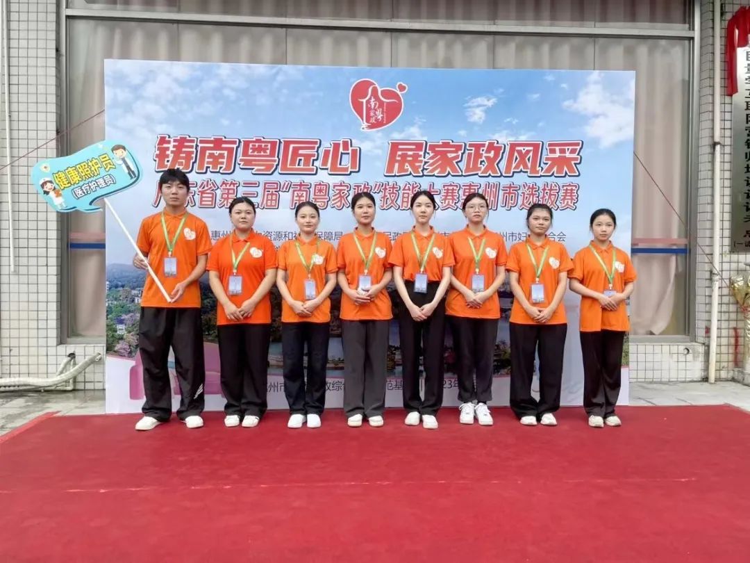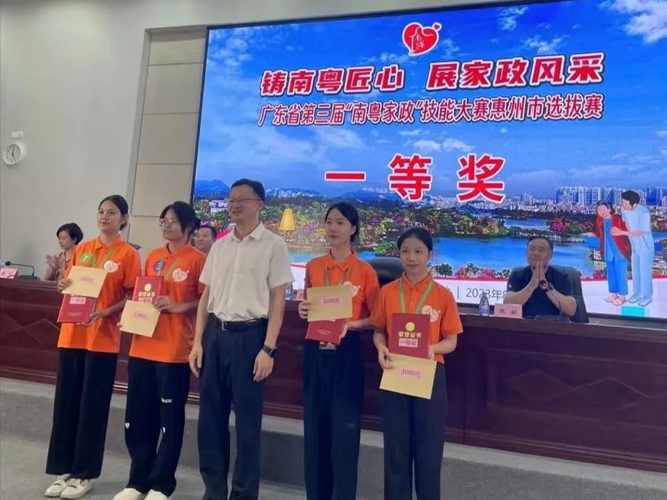 9月26日,获得惠州市选拔赛一等奖选手叶静璇同学和余思敏同学代表惠州市参加在梅州举办的“广东省第三届“南粤家政”技能大赛”,其中叶静璇同学在养老护理员版块竞赛中获得优胜奖。