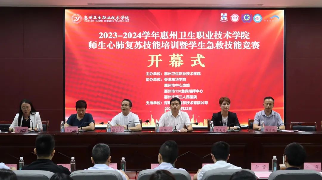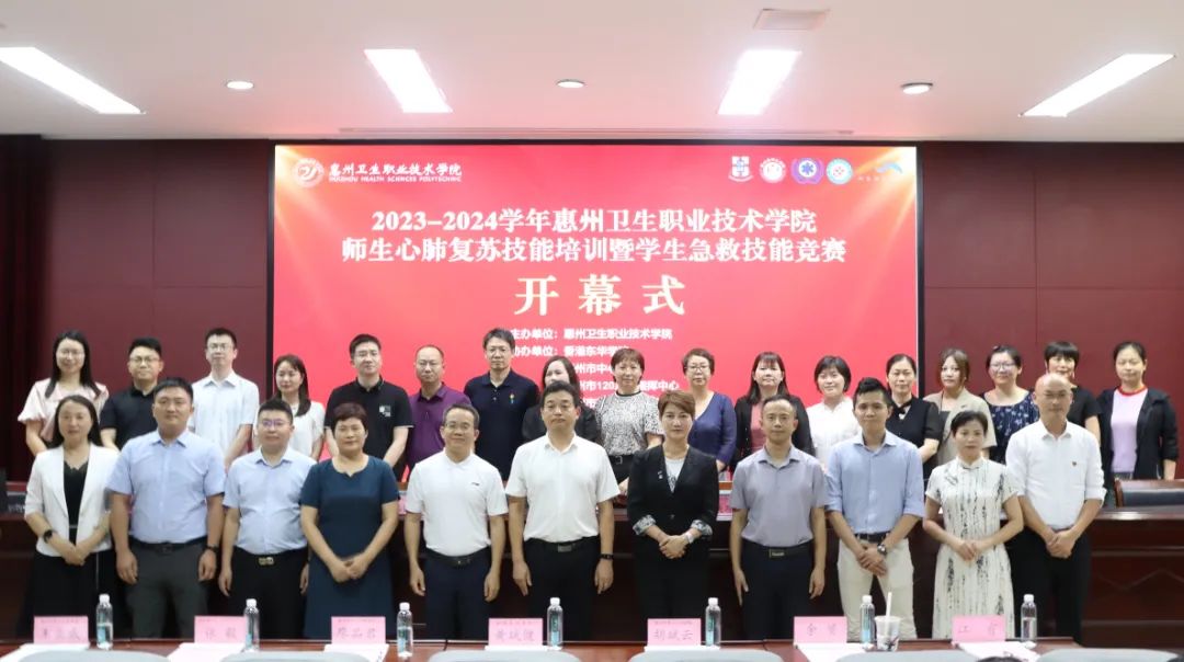 为落实《健康中国行动(2019-2030年)》和教育部办公厅《关于进一步推进学校应急救护工作的通知》要求,落实全国学校急救教育试点工作指导意见,推动校园健康建设,进一步提高全校师生急救意识和急救能力,2024年5月22日下午,由护理学院主办的2023-2024学年惠州卫生职业技术学院师生心肺复苏技能培训暨学生急救技能竞赛开幕式于学校图书馆多功能报告厅举行。学院校长琚雄飞、香港东华学院护理学院教授陈美玲女士、香港东华学院护理学院教授黄斌健先生、惠州市中心血站站长张国良、惠州市120急救指挥中心主任程晋鹏、惠州市第三人民医院护理部主任李林枝、惠州市120急救指挥中心科长张毅、惠州市第三人民医院主任医师廖品君、惠州市第三人民医院副主任医师李云桥、惠州市第三人民医院主治医师胡斌云、惠州市第三人民医院主管护师王亚威、惠州市第三人民医院护理师温伟莲、学工部部长余赟、护理学院党总支书记江有以及护理学院全体教师和学生代表等400余人出席了活动。活动由护理学院高丽玲院长主持。