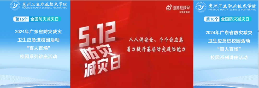 2024年5月12日是第16个全国防灾减灾日,5月11日-17日为防灾减灾宣传周。5月14日上午10点在多功能报告厅,惠州卫生职业技术学院承办了由广东省卫生健康委员会、广东省教育厅、广东省红十字会、广东省中医药局、广东省疾病预防控制局多部门联合主办的2024年广东省防灾减灾卫生应急进校园活动“百人百场”校园系列讲座活动。学校很荣幸邀请到广东省职业病防治院和惠州市职业病防治院的两位专家给我们作这次主题为“人人讲安全、个个会应急--着力提升基层防灾避险能力”的讲座。