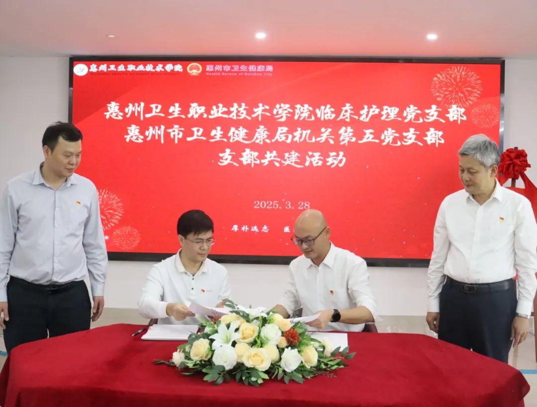 会上,双方党支部举行了共建签约仪式。根据共建协议,双方将以提升惠州市社区和乡镇居民的应急救护水平为核心目标,通过学校党组织和市级机关党组织结对共建的形式,有效整合党建资源,发挥各自优势,形成政校基层党建工作互带互动、优势互补、资源共享的合作新模式,建立“一核双驱多元合作共建”机制,打造标准化、可复制的应急救护培训模式,共同提升惠州市基层应急救护能力,形成政府主导、院校支持、社区和乡镇卫生院协同参与的应急救护培训新格局。