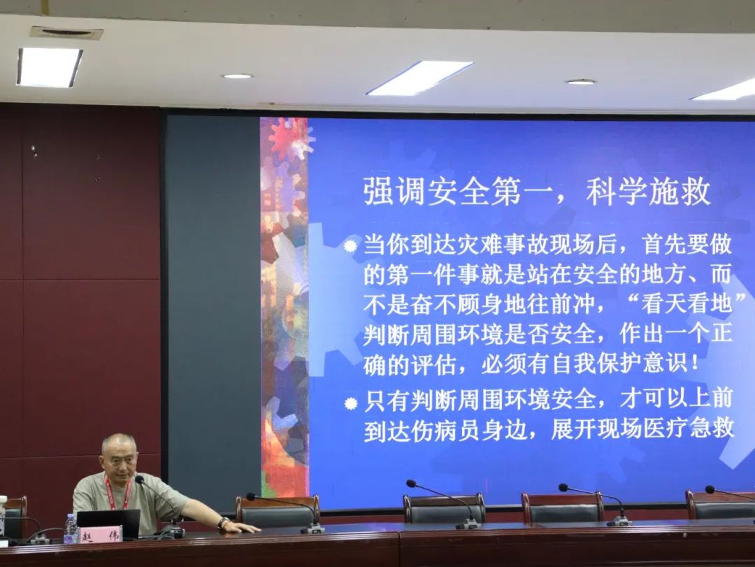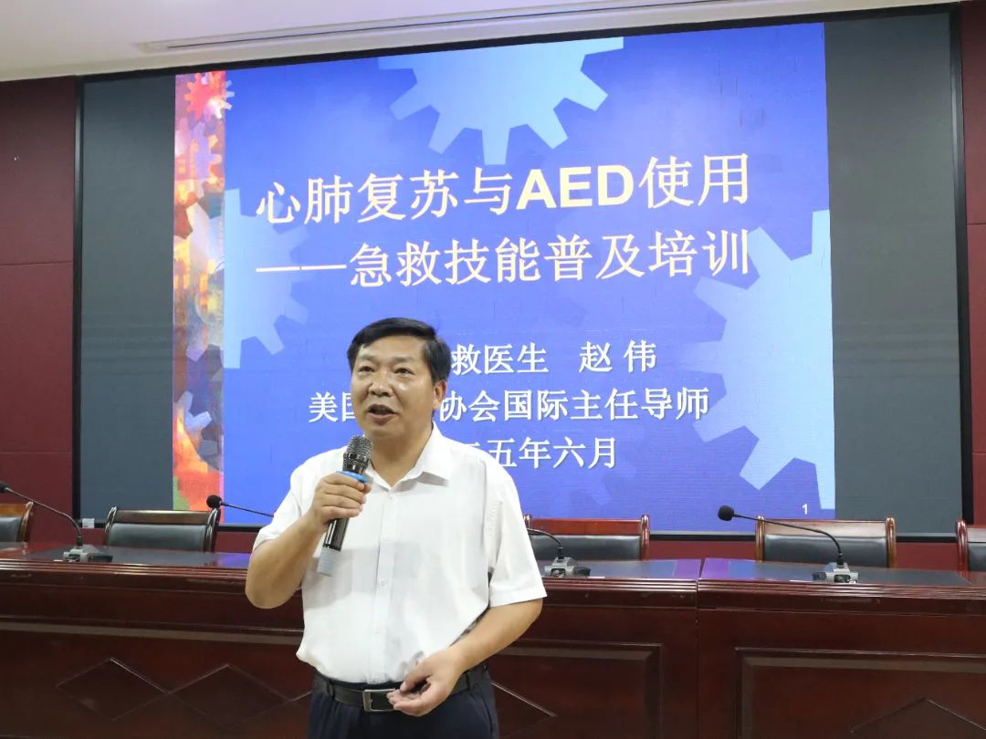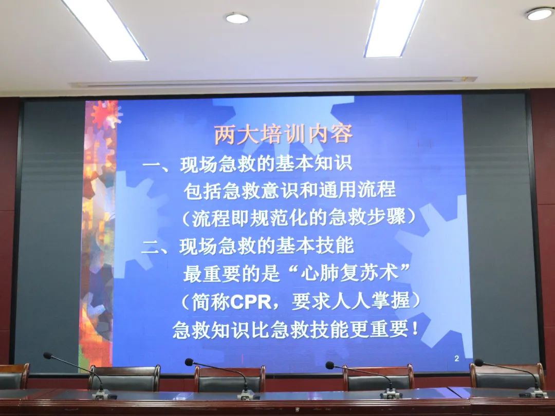 上午的理论培训在多功能报告厅举行。培训内容包含心肺复苏(CPR)和自动体外除颤器(AED)使用两大核心技能及意外伤害的处理。赵伟老师结合图文并茂的课件,详细讲解了急救的基本原则、操作流程及注意事项,重点阐述了心肺复苏的标准步骤和按压姿势、AED的规范使用方法,以及二者配合使用的关键要点;止血、包扎、固定、搬运等基本求助方法。在提问环节,教职工们踊跃发言,就"如何判断是否需要心肺复苏"、"AED使用时的环境安全评估"等专业问题展开深入探讨,有效夯实了理论基础。