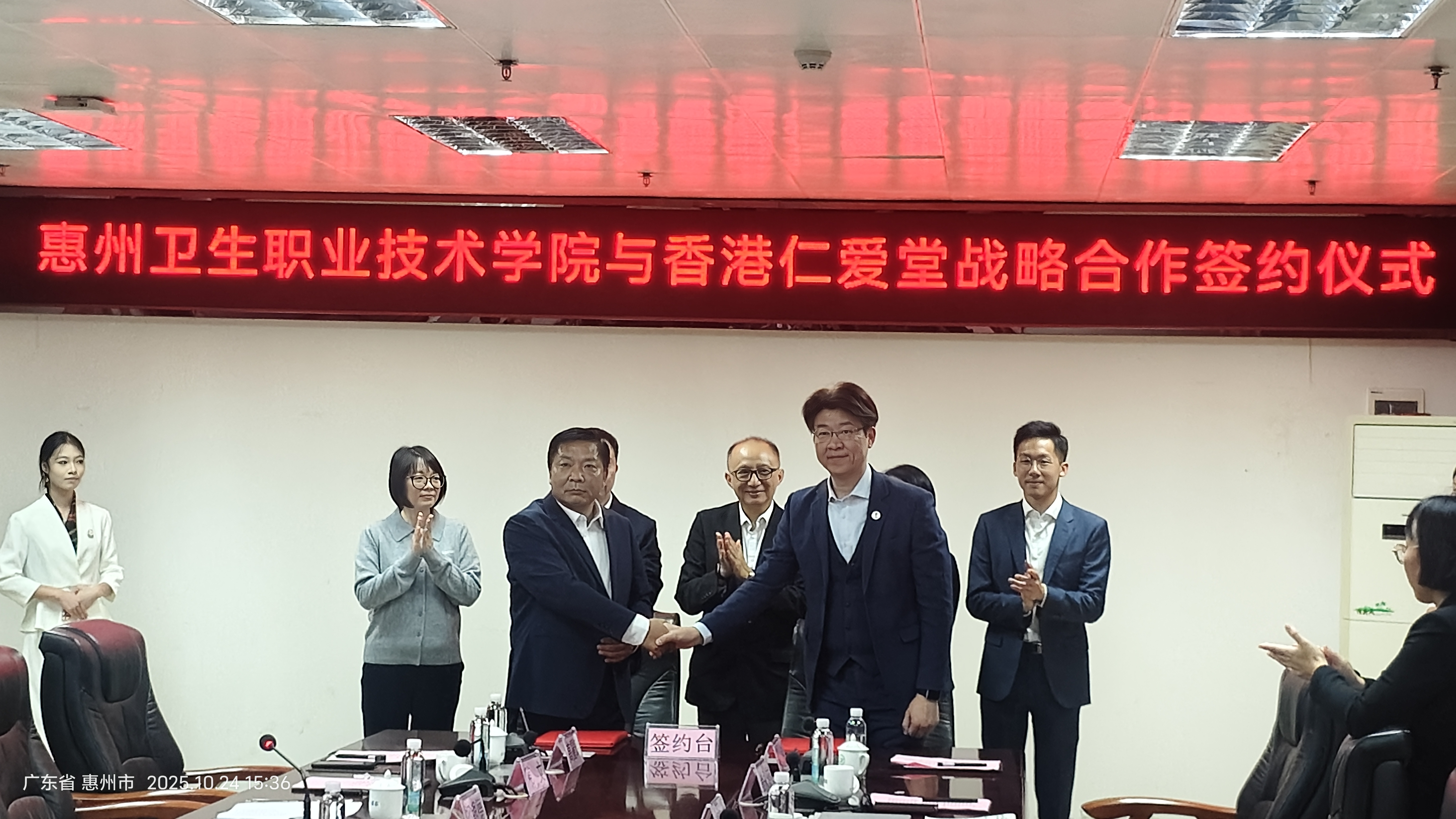 金秋十月,惠港同心。2025年10月24日14:40,惠州卫生职业技术学院行政楼407会议室内掌声阵阵、暖意融融,学校与香港仁爱堂战略合作签约仪式在此隆重举行。这场跨越粤港的“养老人才培育牵手”,不仅汇聚了香港社会福利署首席顾问(安老服务)陈德义,香港仁爱堂主席何俊亨、行政总裁赵文坚,惠州市教育局、市民政局等政企校多方代表,更标志着粤港澳大湾区养老领域产教融合迈出“从蓝图到实践”的关键一步。