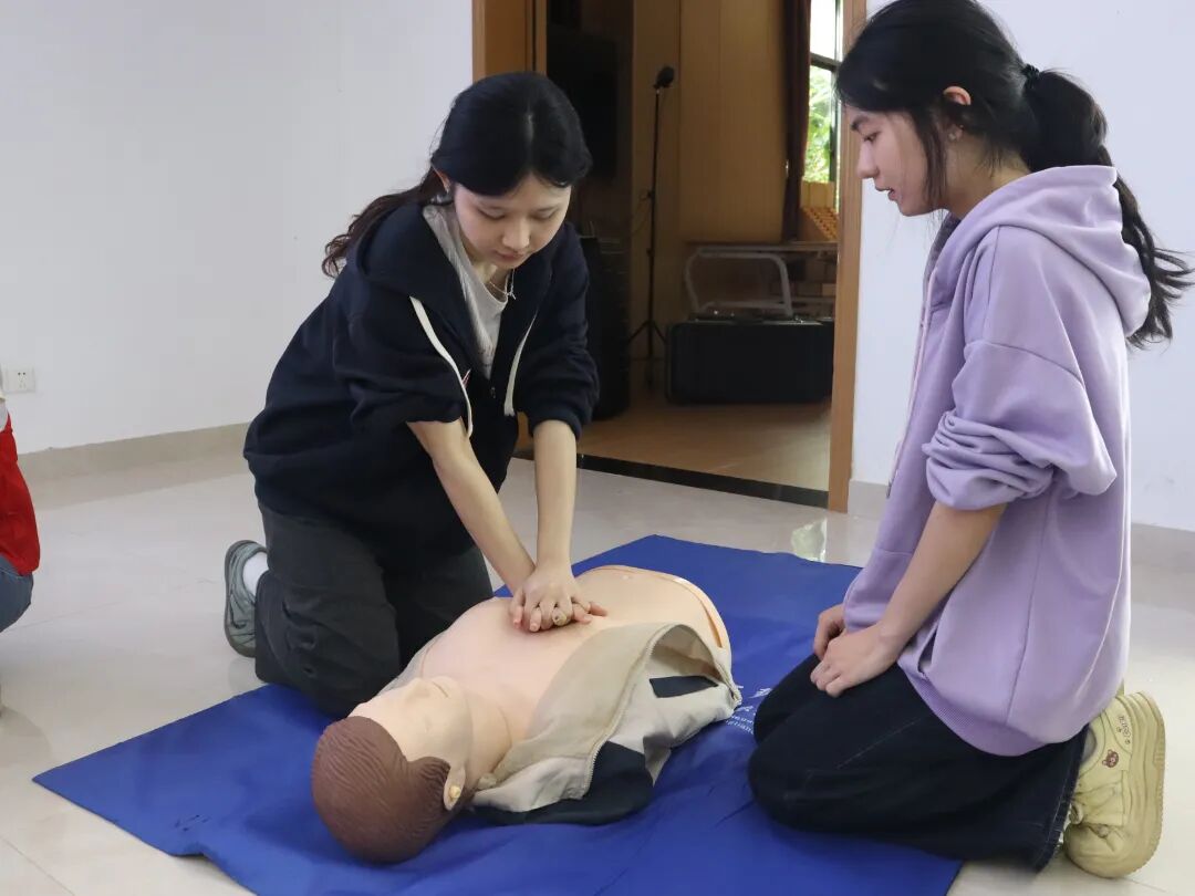 活动伊始,李文婷老师向学员们阐述了应急急救的重要性、心肺复苏(CPR)的注意事项以及自动体外除颤器(AED)的使用方法。指导老师们借助医学模拟假人,向学员们演示了心肺复苏的正确手法、注意事项和按压要点,随后示范了自动体外除颤器的使用流程。紧接着,李文婷老师为学员们讲解了海姆立克急救法的知识要领,以及如何正确使用三角巾进行外伤包扎。指导老师们通过真人模拟,为同学们演示了不同部位受伤时的包扎方法与技巧。