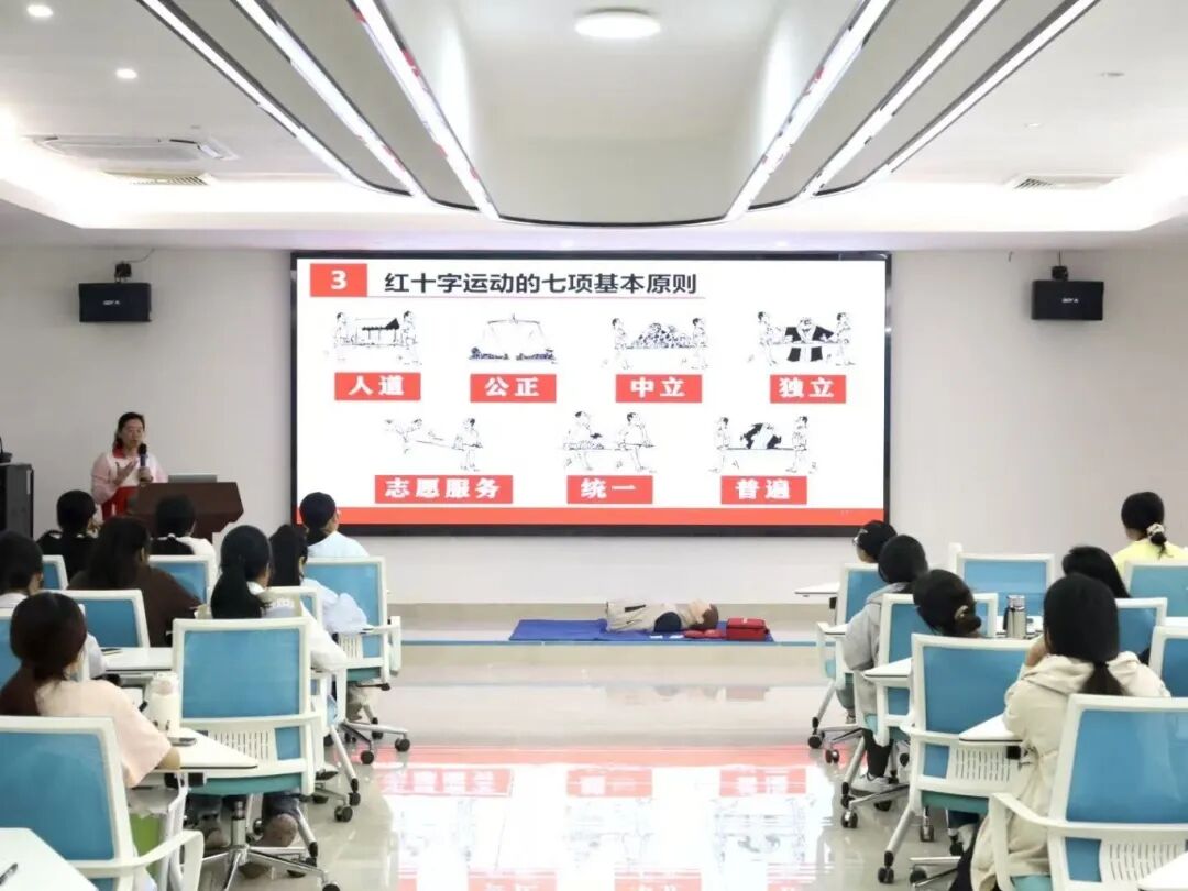 培训伊始,主讲老师何晓秋以红十字“人道、博爱、奉献”精神为切入点,先阐明了红十字运动的七项基本准则及相关知识,后结合真实急救案例,系统讲解了“黄金急救时间”的重要性,还逐项拆解了心肺复苏的按压深度、频率,以及AED的规范操作步骤。深入浅出的理论讲解,帮助学员快速理解了“急救操作背后的医学逻辑”。