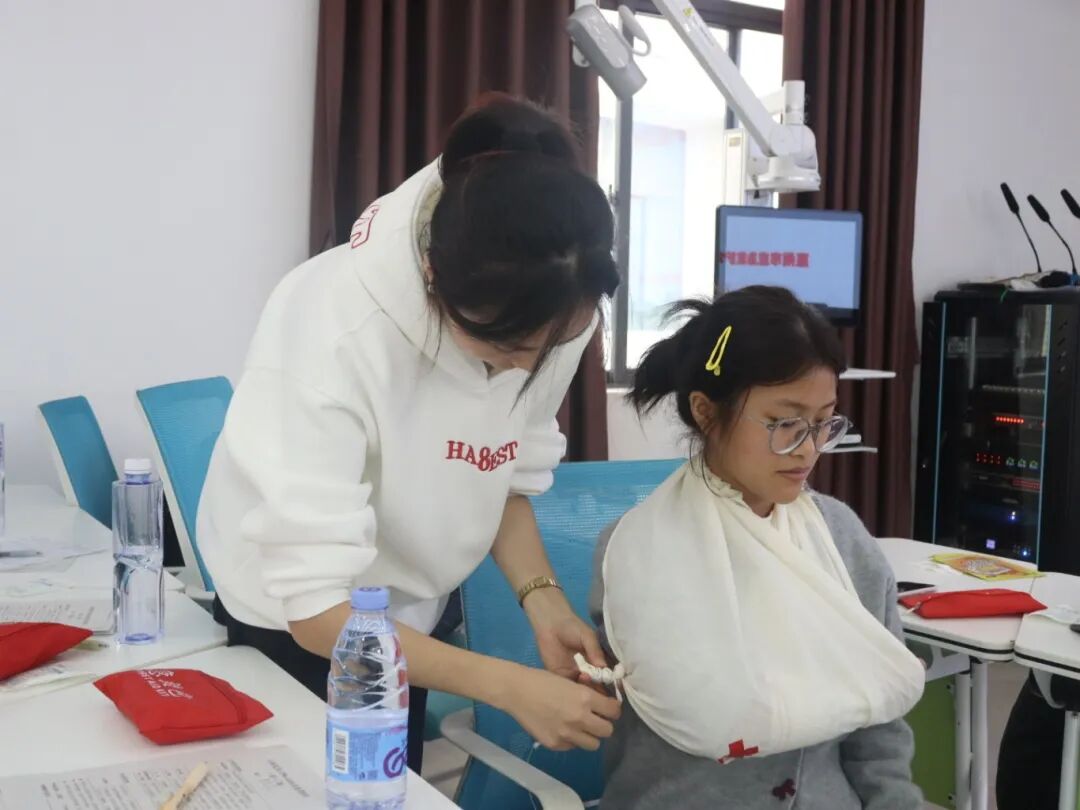 实操环节采取分组指导形式,老师细致讲解并演示三角巾在不同场景的多种用途,和头部、手部等不同部位的包扎技巧。在模拟真实急救场景中,学员两两搭档,轮流扮演施救者与伤员,反复练习、相互纠正。助教全程巡回指导,及时规范操作细节,确保每位学员掌握扎实的实操技巧。现场学习氛围浓厚,节奏紧凑有序,通过亲手操作,学员们成功将理论知识转化为可靠的实践技能。