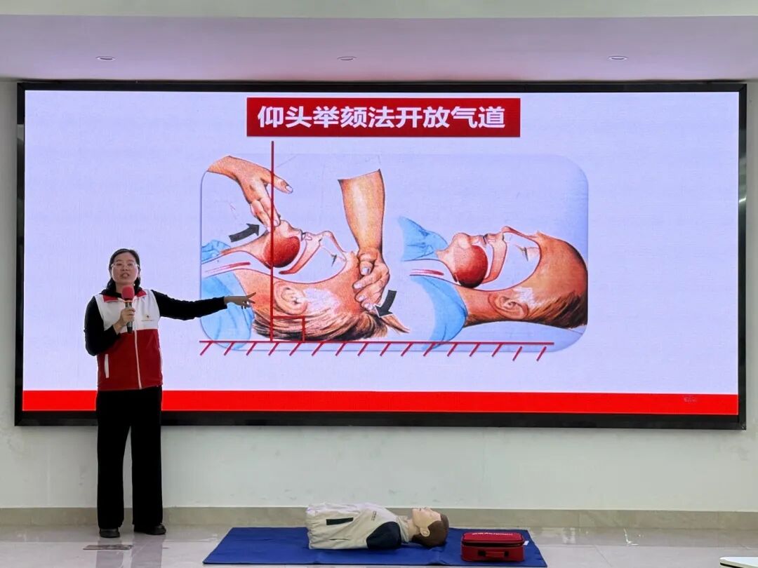 上午的培训以理论教学为主。开班仪式后,何晓秋老师通过“PPT演示+现场讲解”的方式,系统讲授了红十字运动知识、心肺复苏(CPR)与自动体外除颤器(AED)的使用、海姆立克急救法、创伤救护以及常见意外伤害处置等内容。助教童小珍、冯瑶老师全程配合,协助开展教学辅助工作。上午课程结束后,培训班于11:30组织学员进行了理论考试,及时巩固和检验学习成效。