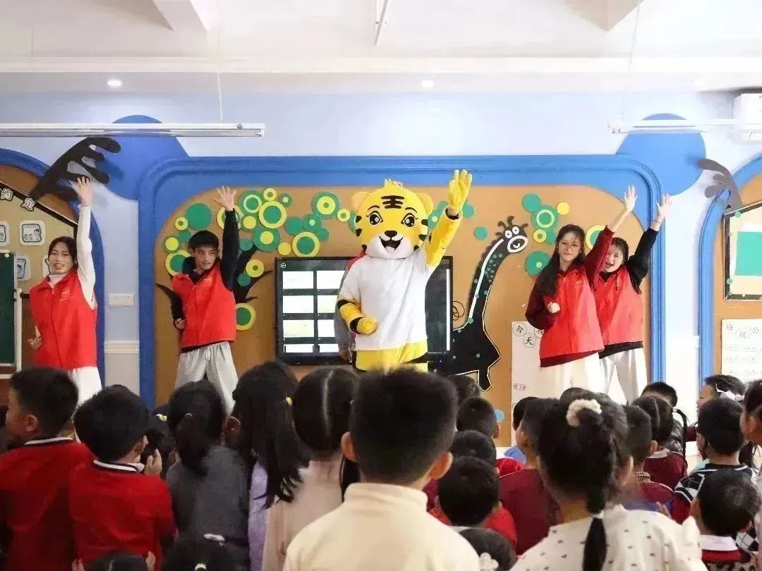 活动开始,为了活跃课堂气氛,志愿者服务队的同学们给小朋友们带来欢快的开场舞蹈和手语操,小朋友们也随着音乐一起舞动起来。