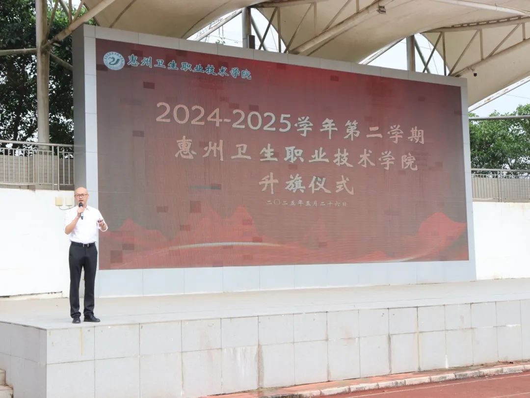 为深入推进理想信念教育,传承红色基因,筑牢同学们的信仰之基。护理学院于5月26日上午在风雨操场举行爱国主义教育——升旗仪式。惠州卫生职业技术学院院长祁银德、副院长王士刚、党政办、校友办、计财部、继续教育学院全体成员及护理学院全体师生一同参加了这一庄严的仪式。升旗仪式由护理学院党总支书记江有主持。