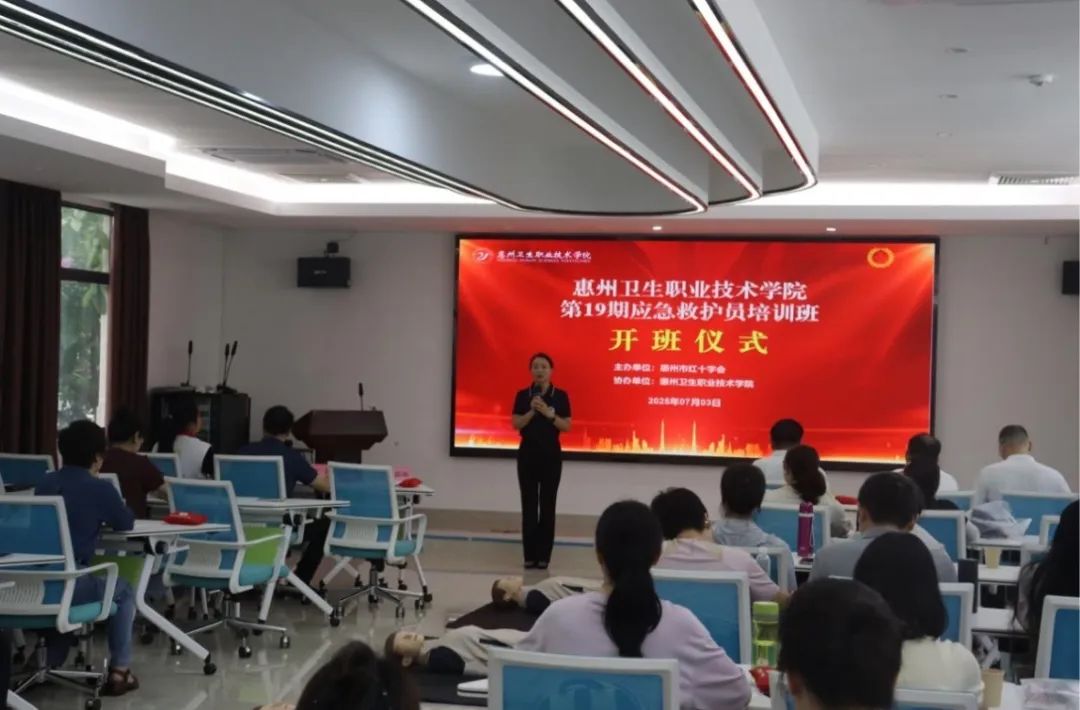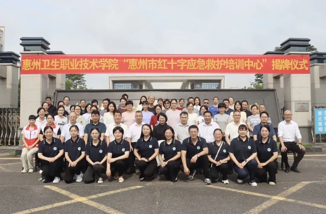2025年7月3日,惠州市红十字应急救护培训中心在惠州卫生职业技术学院正式揭牌,学校第19期应急救护员培训班同步启动。校党委班子以“头雁效应”引领示范,校党委书记、校长率校领导、部门负责人、教师党员共100人参训,以“关键少数”示范效应,推动急救教育与专业志愿服务深度融合。