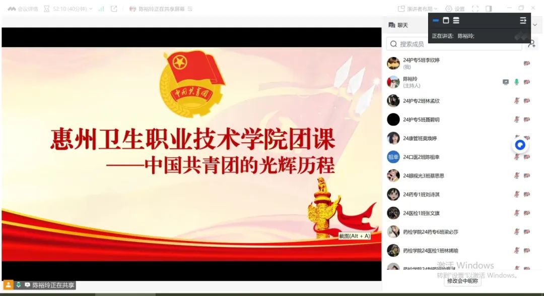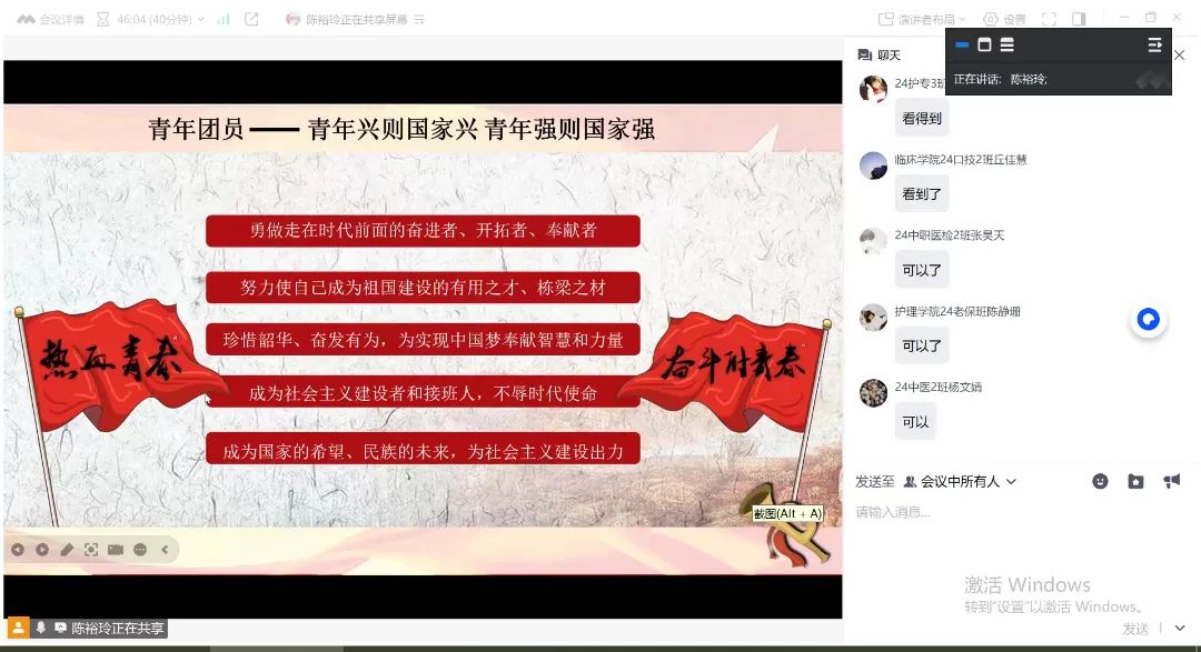 护理学院团委书记陈裕玲老师以一系列发人深省的问题开启团课,如 “共青团的内涵是什么”“共青团的诞生背景与发展历程” 以及 “共青团与中国共产党的紧密联系”。线上互动区瞬间活跃起来,同学们纷纷通过弹幕和留言参与思考与讨论,有效增强了他们对共青团组织的理解与认识。陈老师强调,深刻领会共青团的精神内核,是每一位入团积极分子的必修课。