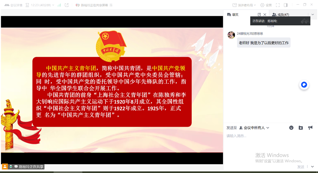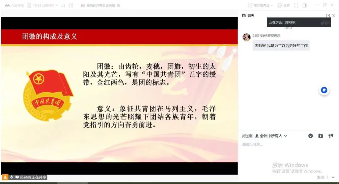 在团课讲授环节,陈裕玲老师借助线上屏幕共享功能,全面阐述了共青团的性质、基本职能,详细解读了团徽、团旗的构成及其深远意义,并回顾了共青团自创建以来的重要历史阶段与发展脉络,特别强调了新时代背景下共青团员所肩负的历史使命。通过深入浅出的讲解,同学们即使身处不同地点,也能系统掌握共青团的基础知识,深刻感受到共青团在不同历史时期的重要作用与光荣使命。