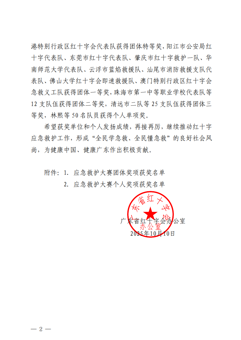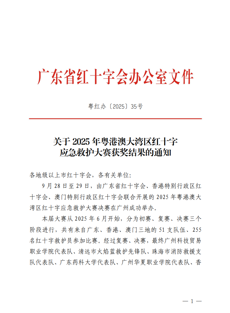 近日,《关于2025年粤港澳大湾区红十字应急救护大赛获奖结果的通知》正式发布,在学校党建工作的引领下,我校师生组建的两支代表队——惠州市红十字会代表队与惠州卫生职业技术学院红十字会代表队,在大赛中脱颖而出,双双荣获二等奖,充分彰显了我校党建与专业实践深度融合的丰硕成果。
