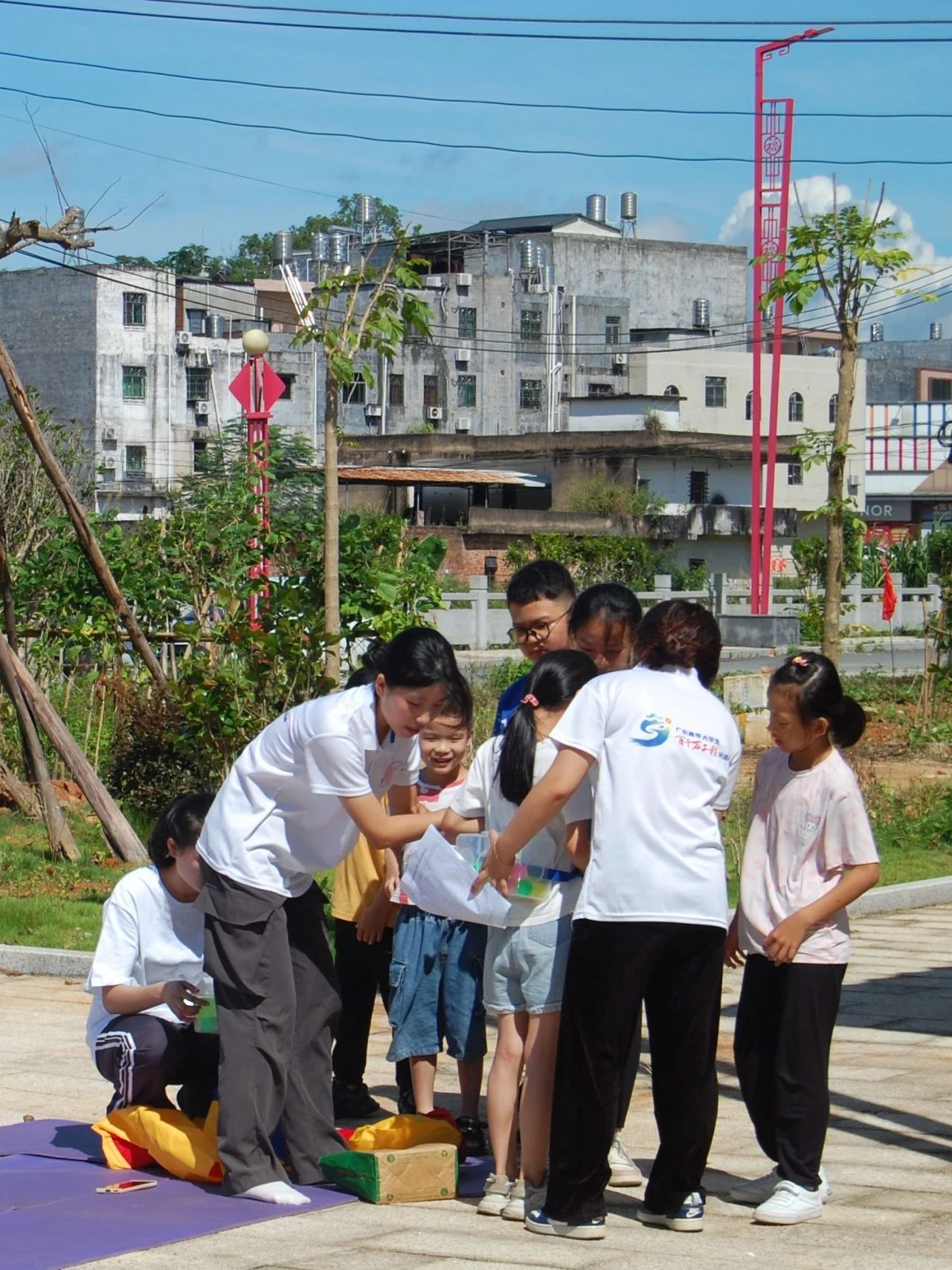 在文化站室外门口将孩子们分组进行团辅游戏“袋鼠跳”、“手忙脚乱”、“公鸡下蛋”
