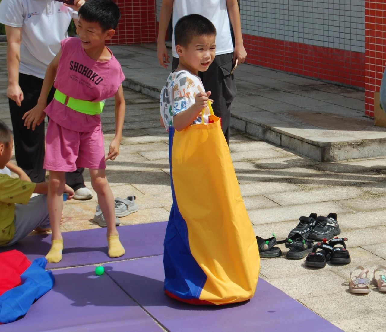孩子们在阳光明媚的室外开心地玩着袋鼠跳,他们欢声笑语,兴奋地竞相跳跃和追逐。
