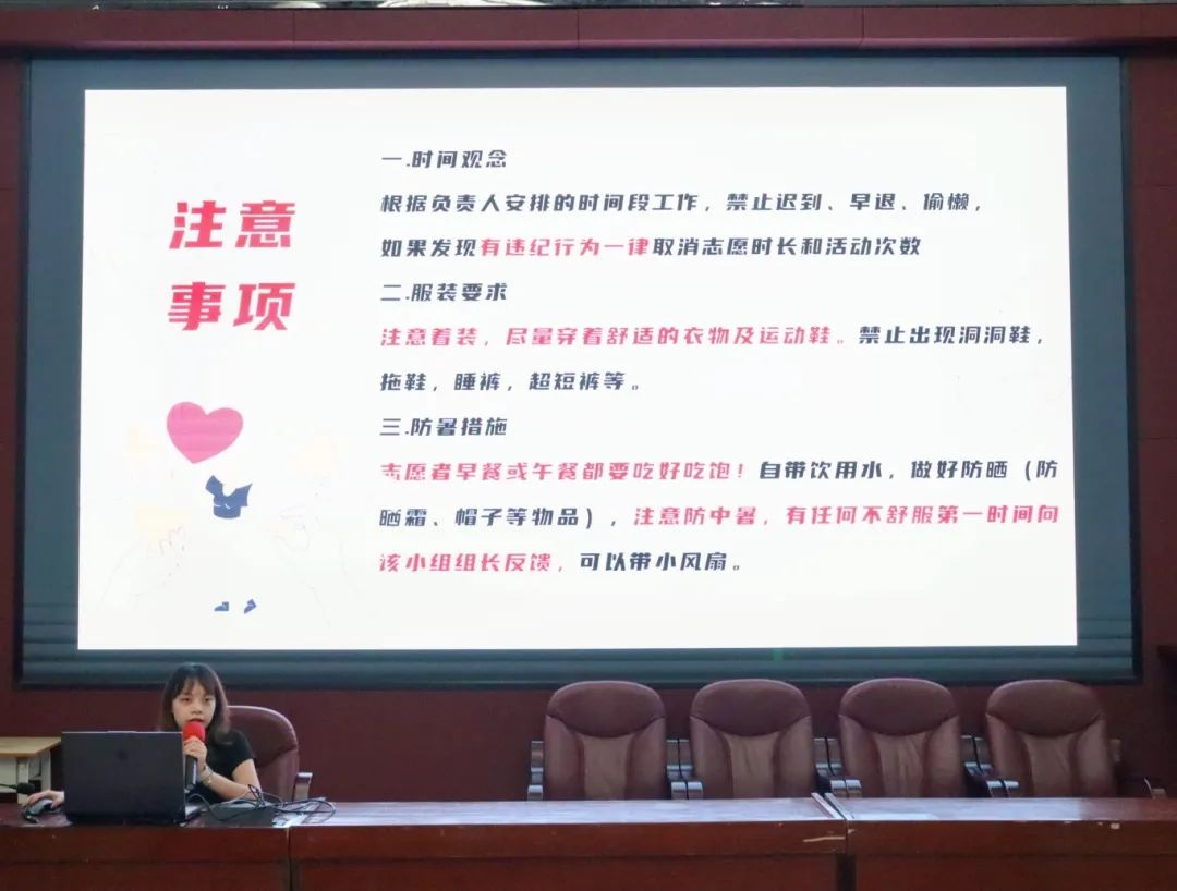 会议伊始,学校学工部部长余赟对迎新志愿服务工作进行了整体的介绍,详细讲解了志愿者们工作职责和内容。随后,护理学院团委副书记谢怡琪老师则向大家详细讲解了迎新工作的具体分工,并在讲解中提醒志愿者们要按时到岗,做好防暑措施等注意事项,确保迎新工作在各个环节圆满顺畅。