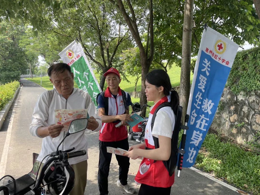 随着活动接近尾声,在应急救护流动宣传的最后一项活动中,由应急救护小分队杜老师带领数名志愿者身背户外背包旗杆,沿江边人行道徒步三公里,向过往市民发放应急救护宣传折页,让大家掌握基本的急救技能,提高自救互救能力,为构建更加安全、健康、和谐的社会环境贡献力量。