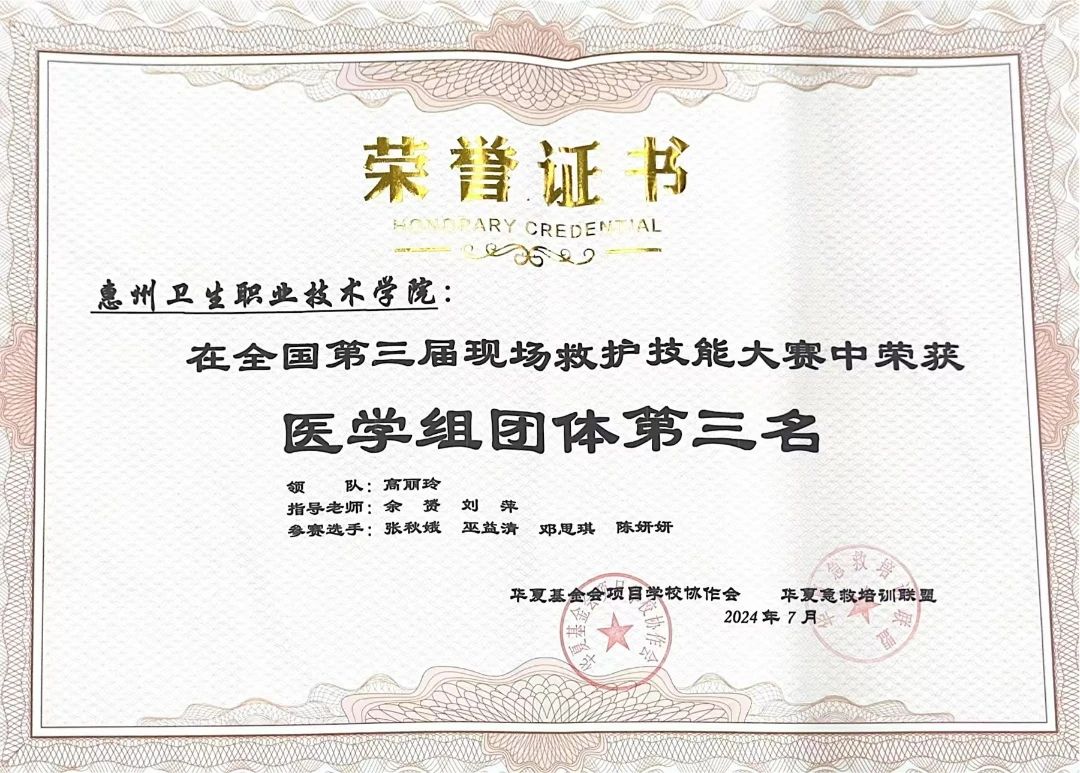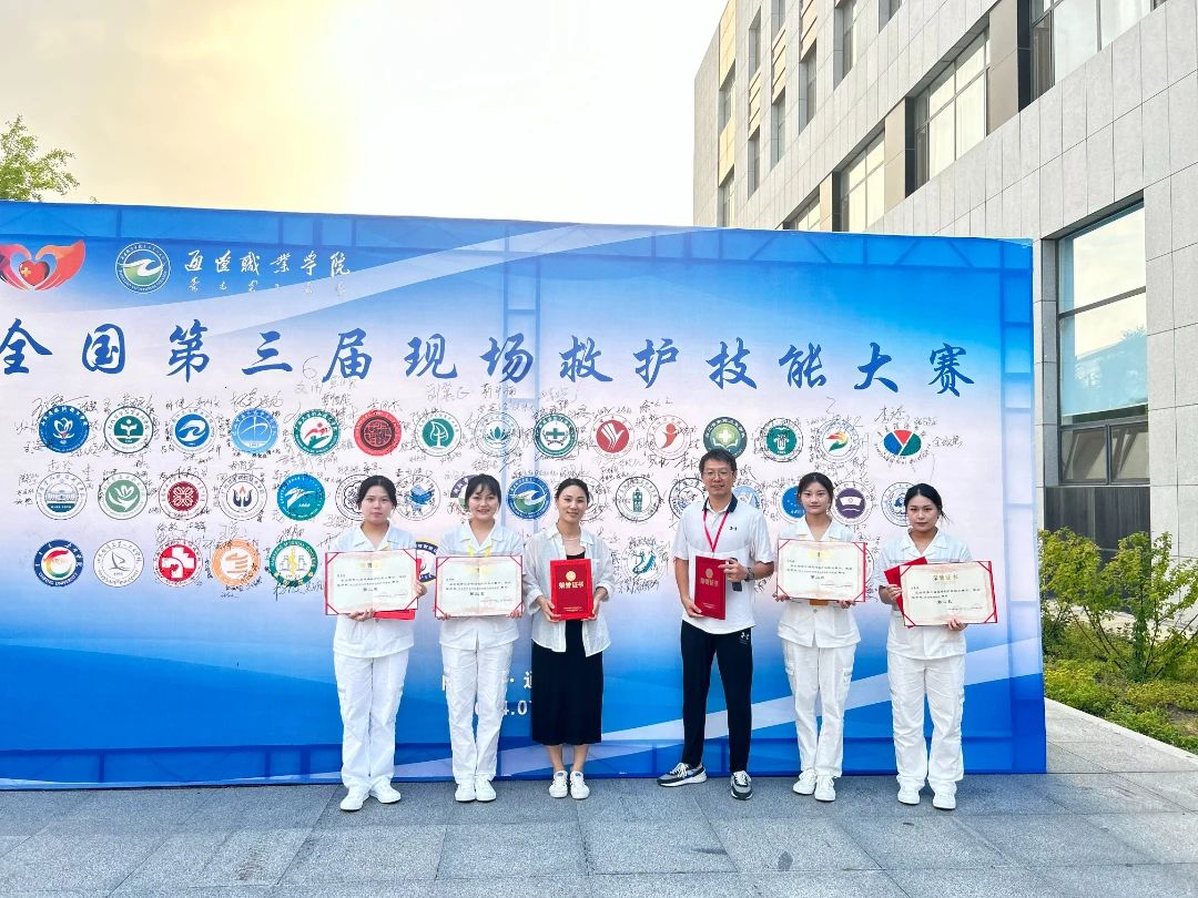 大赛全面考核学生的现场救护操作技能、沟通能力、分析问题、解决问题的实际能力和人文关怀等方面的核心能力。护理学院代表队在竞赛中表现出色,获医学组团体第三名;23级助专2班张秋娥、23级护专9班邓思琪在第一站“双人徒手心肺复苏现场救护与管理”荣获单项二等奖;23护专10班巫益清在第二站“烫伤病人的现场救护”荣获单项三等奖;23级助专2班陈妍妍在第三站“突发意外单个危重创伤病人现场救护”荣获单项三等奖;余赟、刘萍2位老师获“团体第三名优秀指导教师”称号。
