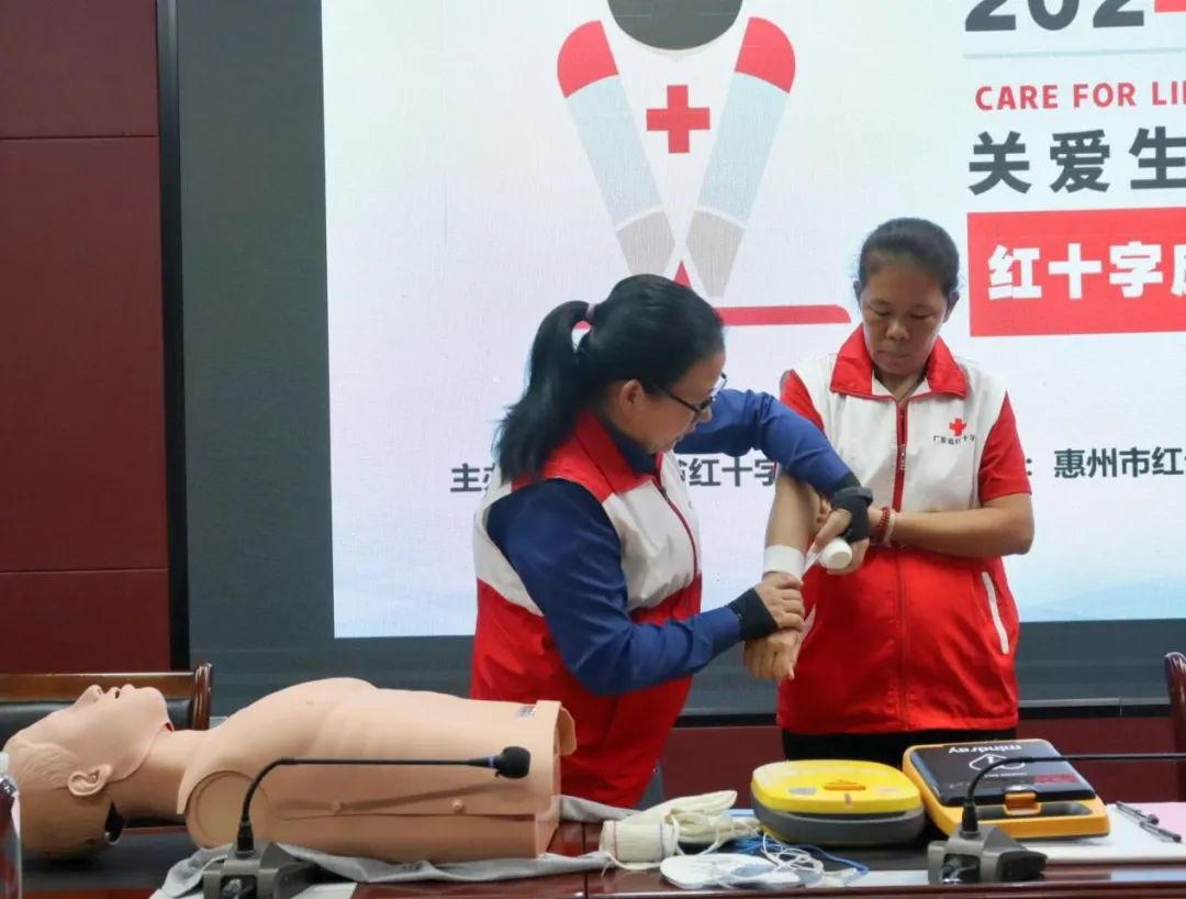 在实际操作环节,师生们热情高涨,在罗慧老师与吴惠珊老师的鼓励和耐心的指导下,学员们踊跃的参与现场实践,大家亲身体验了心肺复苏、AED使用及海姆立克的操作要点,还学习了不用伤口的包扎要点。