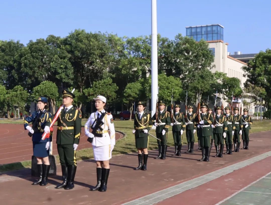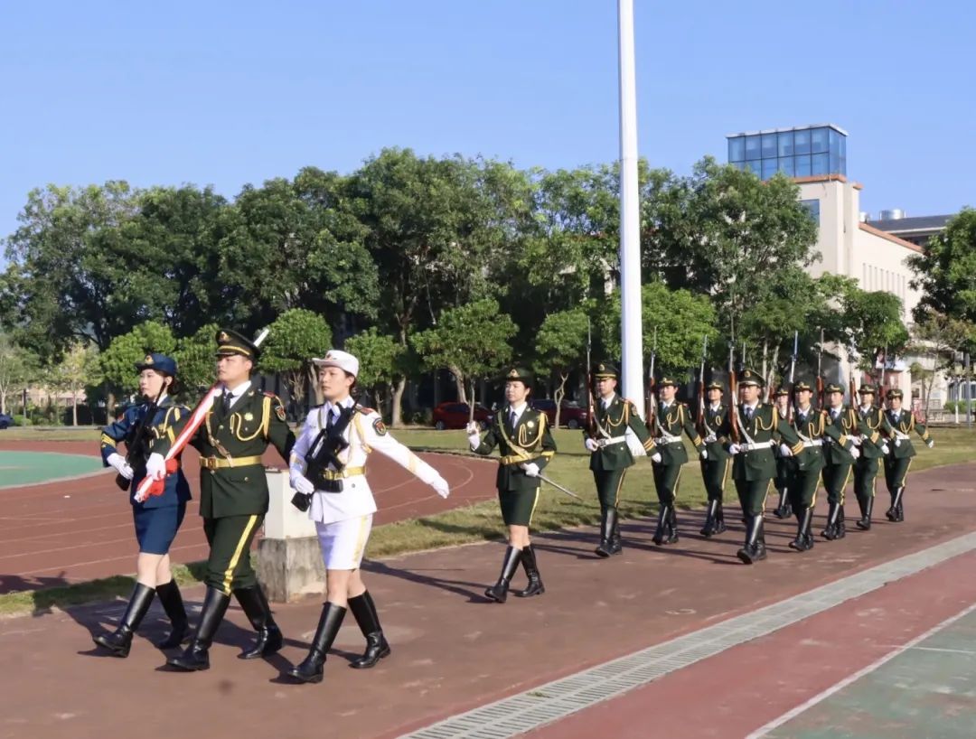 清晨的阳光洒满校园,国旗护卫队员们身着整齐划一的护旗服,迈着铿锵有力的步伐,护送着五星红旗缓缓走向升旗台。伴随着雄壮的义勇军进行曲,国旗冉冉升起,迎风飘扬,那抹鲜艳的红旗在蔚蓝天空的映衬下,显得格外耀眼。全体师生肃立敬礼,这一刻,荣耀与使命并存,爱国之情油然而生。