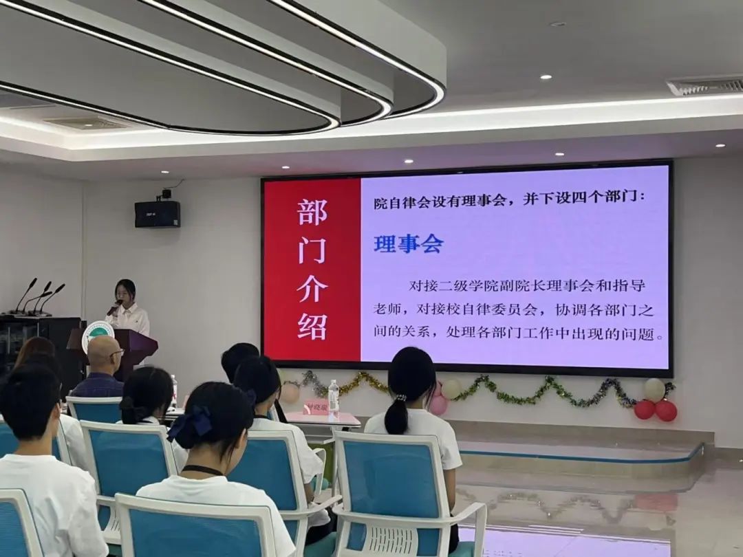 大会伊始,主持人为24级新加入的同学们仔细介绍了自律会的指导老师及自律会各部门的主要职责和部门情况,让同学们对自律会有了更深入的了解与认识,加深了同学们对自律会的归属感。