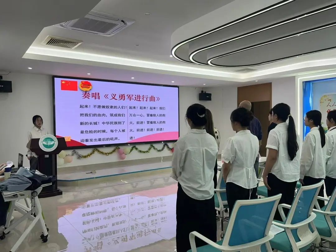 本次会议于同学们嘹亮整齐的国歌声中拉开序幕。