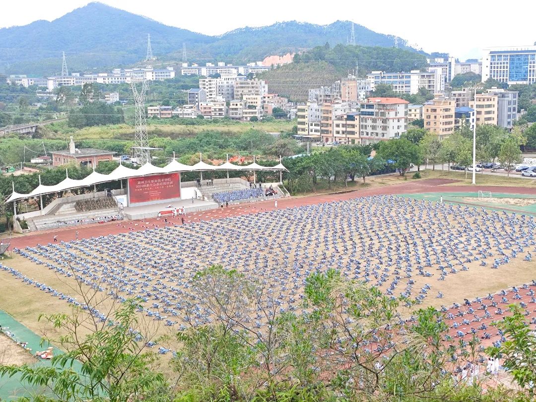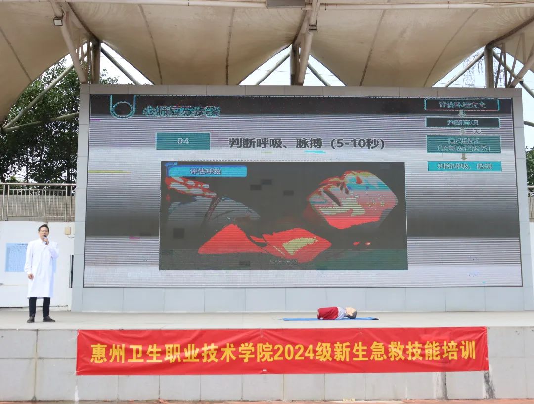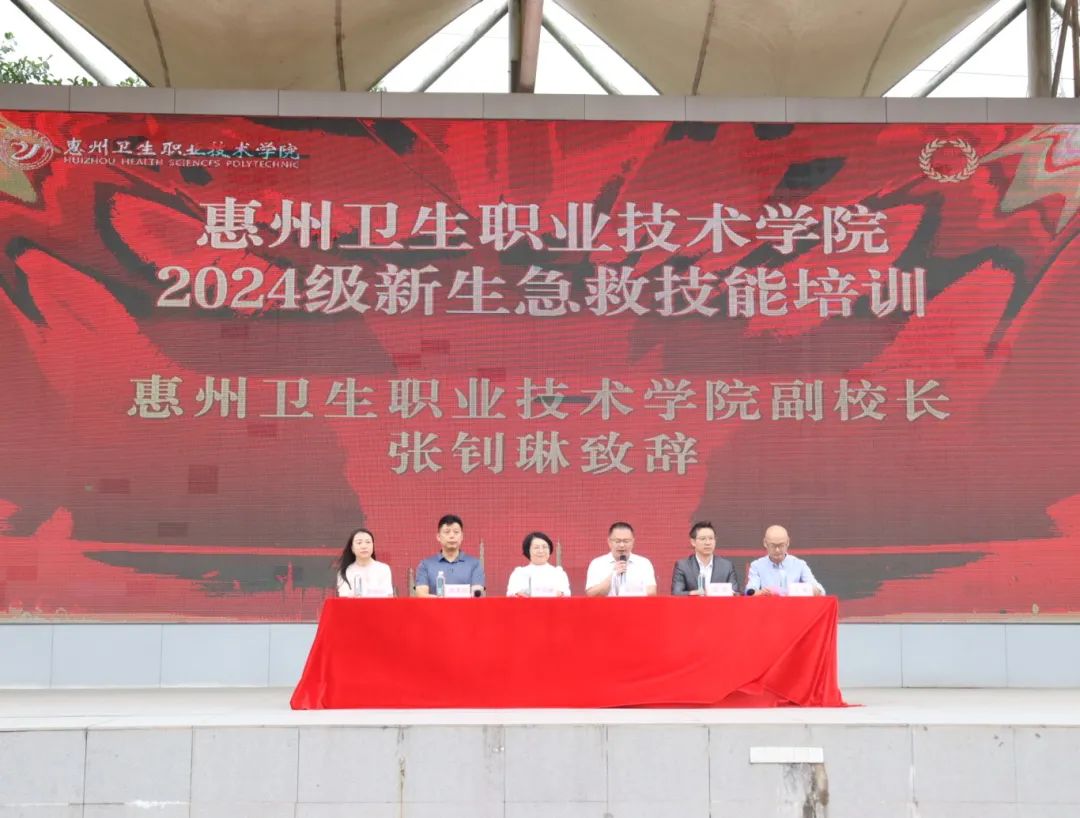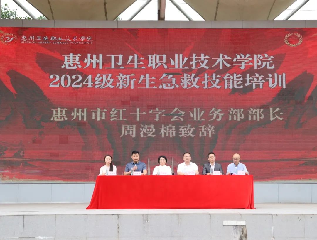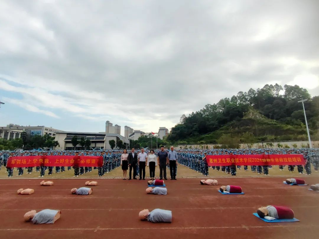 为全面落实国家关于大力发展应急救护教育、教育部关于深化全国学校急救教育试点学校建设管理、强化新时代学校红十字工作精神引领下,积极响应广东省教育厅与省红十字会关于2024年校园应急救护宣传教育活动的号召,利用2024级新生军训这个契机,惠州卫生职业技术学院于11月19日,在风雨操场隆重开展了“军训场上学急救,上好生命必修课”2024级新生急救技能培训。惠州市红十字会业务部部长周漫棉、学校党委书记严丽娜、副校长张钊琳、学生工作部部长余赟、护理学院党总支书记江有、护理学院院长高丽玲,以及各新生班辅导员、班主任共3900余名师生,共同参加了这一意义非凡的活动。