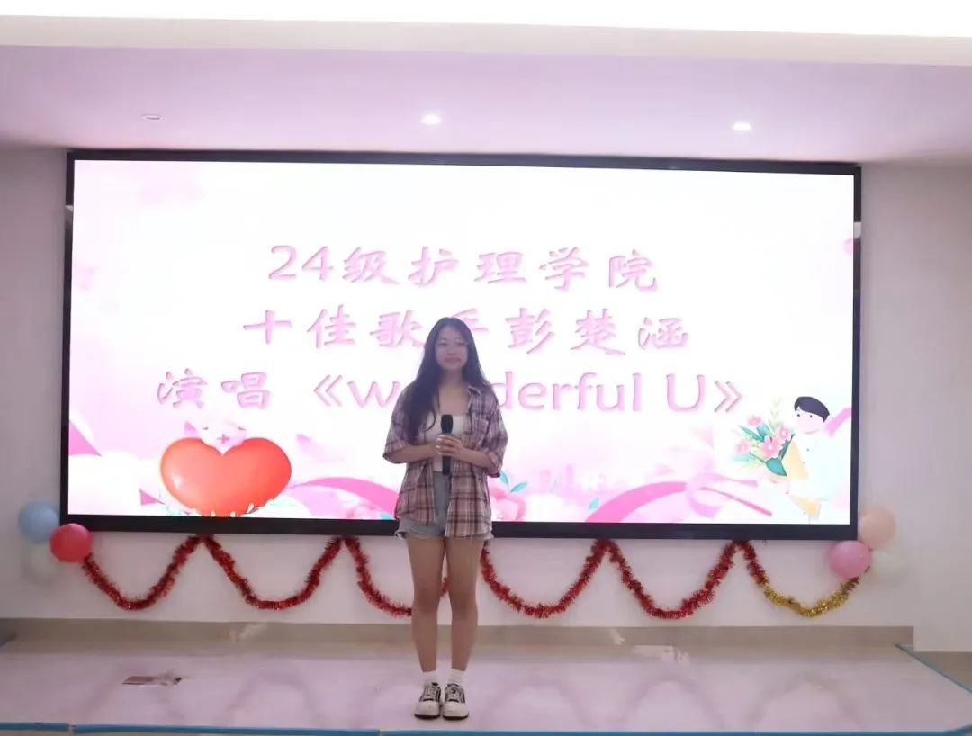 当比赛进入高潮阶段,2024级护理学院的十佳歌手彭楚涵献上了一曲《Wonderful U》,有效缓解了现场的紧张气氛。余音袅袅之后,又迎来了一场视觉盛宴,参赛者们展现了何为白衣素雅的风采。现场比赛赢得了观众的热烈掌声和老师的高度评价。紧接着,十佳歌手张嘉娴带来了《永不失联的爱》,同样博得了观众的热烈掌声。