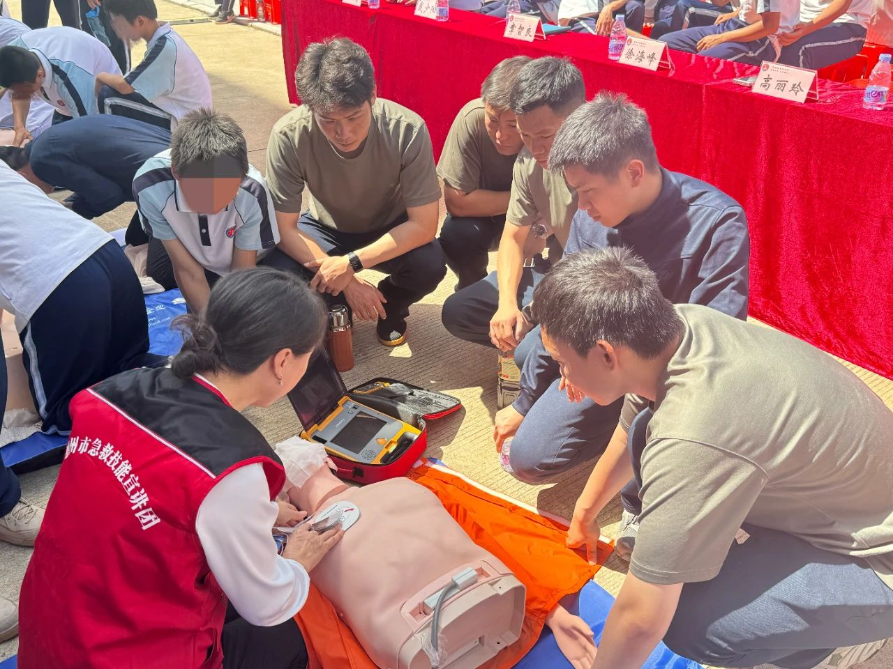 作为全国学校急救教育试点学校,惠州卫生职业技术学院高度重视此次活动,护理学院院长高丽玲、党总支书记江有亲自带队,何晓秋、黄淑萍等专业教师及7名学生志愿者,提前制定详细方案,确保活动扎实有效。