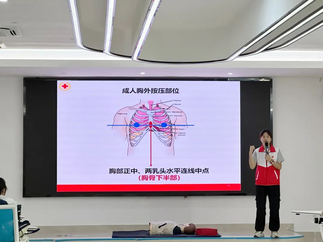 此次培训的内容兼具实用性与专业性,包含了心肺复苏(CPR)、自动体外除颤器(AED)使用、海姆立克急救法及外伤包扎技术。理论讲解环节,钟静容老师以红十字运动的历史渊源为切入点,结合案例分析,生动形象地阐述了在外遇到突发状况时的科学急救原则以及自救技巧,帮助同学们建立了系统的急救认知。实操演示阶段,老师以及专业人员利用医用模拟假人,向同学们展示了CPR规范流程以及AED使用时的操作要点,并通过真人互动,直观演示海姆立克急救的施救姿势以及不同部位创伤的包扎手法。实践互动环节,同学们轮番上前操作,老师以及专业人员对同学们的按压手势、体位角度等细节逐一指导纠正,确保急救技术的规范性。回答互动中,同学们积极参与,进一步巩固了急救知识。