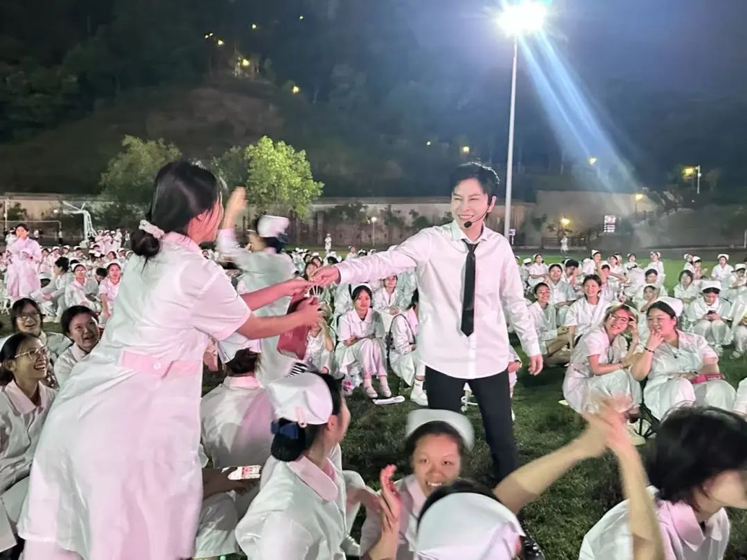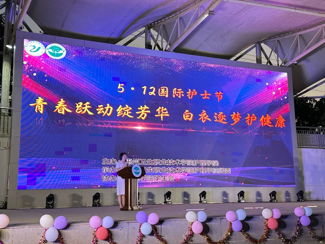 “白衣执甲践初心,烛光熠熠照芳华。”值此第114个国际护士节来临之际,为传承护理文化,弘扬南丁格尔护佑生命、竭诚奉献、专业精湛、勇气非凡的精神,展现新时代护理人的职业风采,5月12日晚,护理学院于风雨操场隆重举行了“ 青春跃动绽芳华,白衣逐梦护健康 ”5.12国际护士节主题文艺晚会。惠州卫生职业技术学院党委书记严丽娜,党委副书记黄育强,副院长王士刚、陈文、党委委员周琳、江海东、梁可、附属医院院长何伟峰,科贸职业技术学校党办主任兼团委书记廖莉娜等领导出席晚会。学校各二级学院党总支书记、院长、学校相关处室负责人以及护理学院全体师生共同观看晚会。