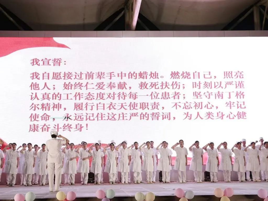 薪火相传承使命,燕帽加冕启新程。一顶燕尾帽,是对南丁格尔的传承;一顶燕尾帽,也是对纯洁与奉献的坚守。在授帽仪式上,伴随着悠扬的乐曲,护生们神色庄严,面容坚毅,由曹玉可、尹红梅、黄淑萍、陈璟、向晓莉、毕桂娟六位护理前辈手托象征护理职业精神的洁白燕尾帽,为即将踏上实习征程的学子们逐一加冕,灯光映照着学子们坚毅的面庞,南丁格尔的誓言在现场久久回荡。这一刻,白衣与灯光交织成动人的画卷,前辈们“ 燃烧自己,照亮他人”的信念化作团团星火,点燃了新一代护理人的赤忱。