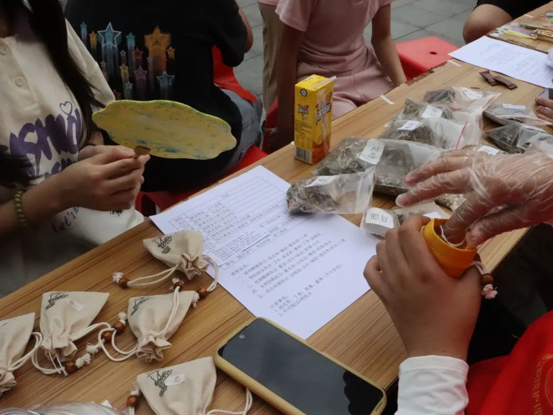 活动前期,红潭卫梦队伍成员深入高潭镇,走访当地居民,积极宣传即将举办的非遗手工活动。他们耐心地向居民介绍活动的目的、意义及具体安排,居民们热情回应,纷纷表示会准时参加。为了确保活动的顺利进行,团队成员还精心准备了活动所需的材料和工具,包括制作香包所需的中医药材、水拓染所需的染料和工具、漆扇制作所需的素扇和环保染料等。