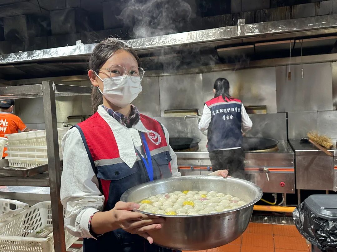 活动前夕,入党积极分子和学生志愿者们早早来到桂园门口布置现场,后厨内一片忙碌景象——一颗颗汤圆在锅中翻滚,逐渐变得圆润饱满,甜香裹着热气在校园里散开。每一颗汤圆都承载着学院党总支对师生的关怀与祝福,也凝聚着学生志愿者服务师生、奉献校园的责任担当。