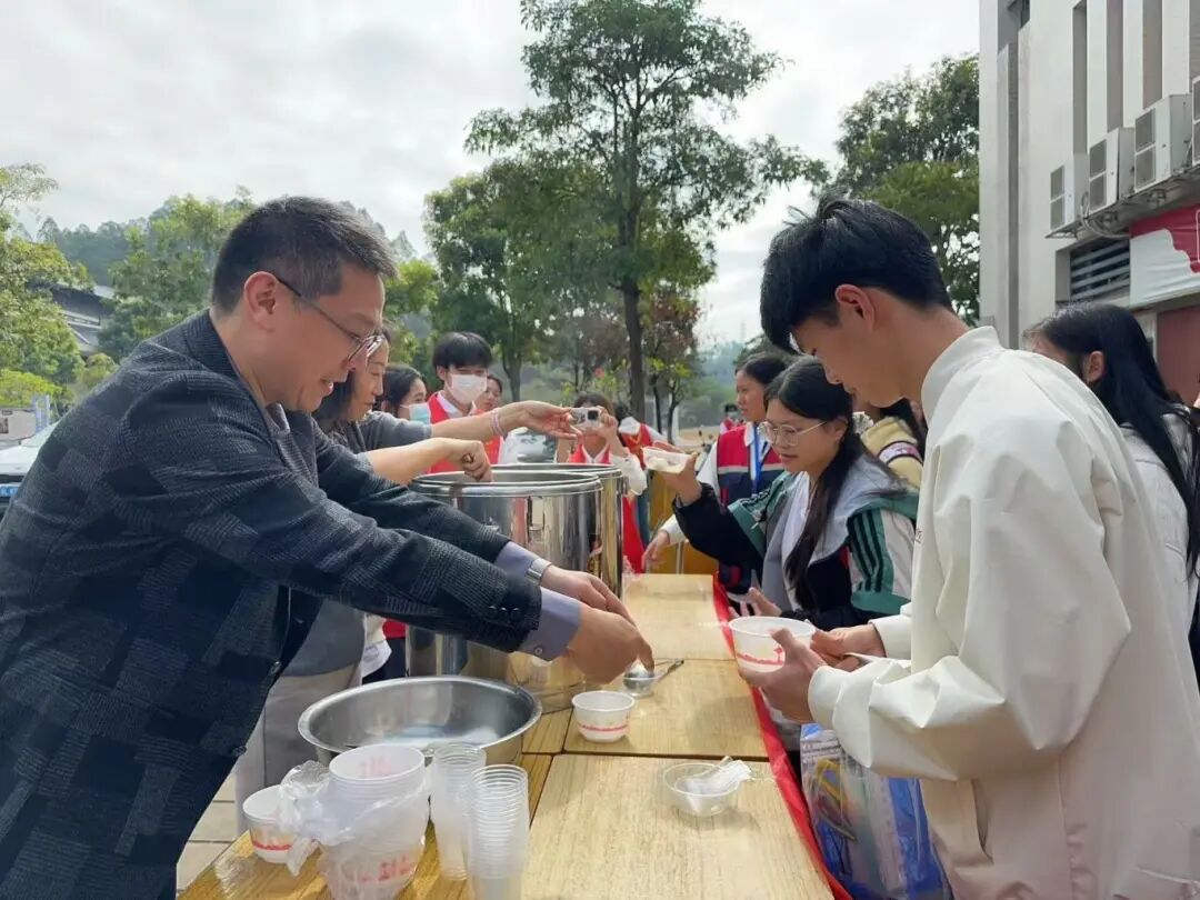 活动当日午间,护理学院党总支书记高丽玲、院长余赟、学管副院长钟晓璇、团委书记陈裕玲、副书记谢怡琪带领入党积极分子和学生志愿者一同在桂园门口迎接往来师生,将一碗碗热气氤氲的汤圆递到师生手中。党员教师率先垂范,学生志愿者积极参与,以实际行动弘扬志愿服务精神,用点滴真情拉近了党组织与师生之间的距离。