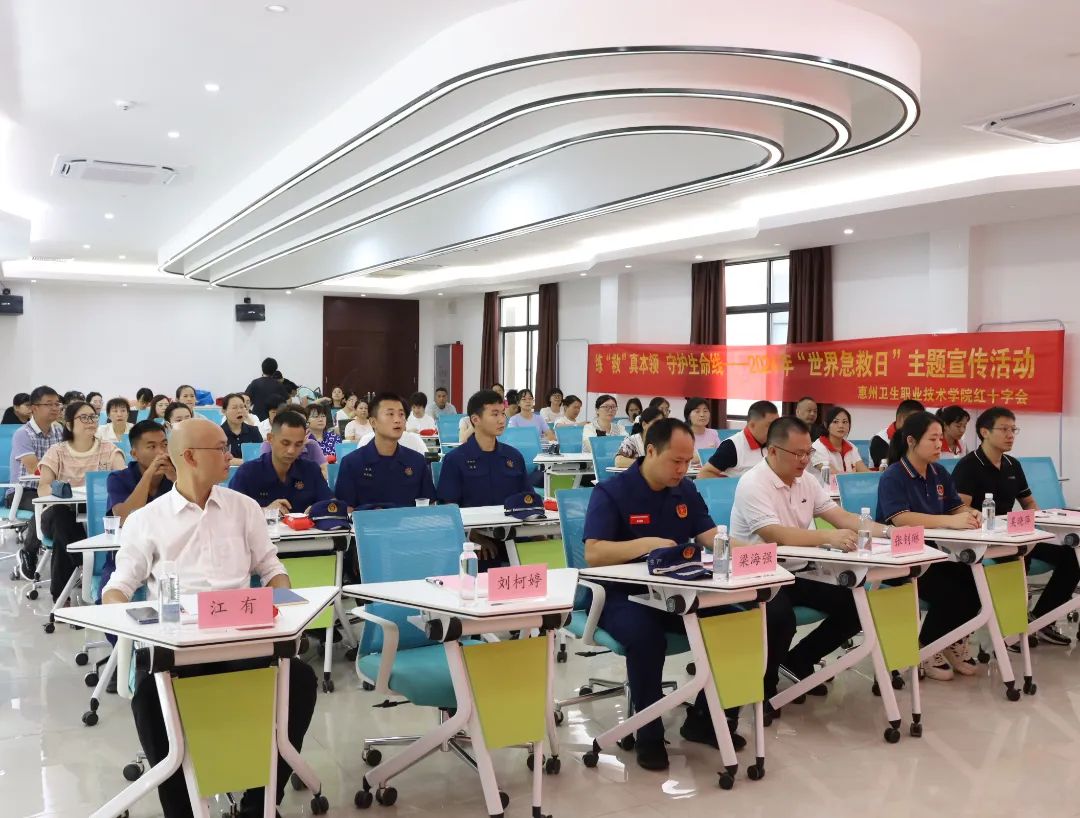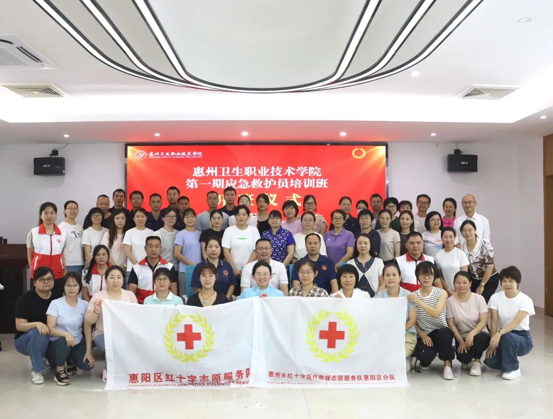 莅临现场的人员有:惠州市红十字医疗救援志愿服务惠阳分队队长吴晓萍老师、惠阳分队副队长何宇胜老师、惠阳分队副队长钟静容老师、惠阳分队秘书长李学彬老师、博罗分队中队长黄向红老师,惠州市应急救援支队队长梁海强,惠州卫生职业技术学院副校长张钊琳、学生工作部部长余赟、护理学院党总支书记江有、护理学院院长高丽玲及培训班学员们。