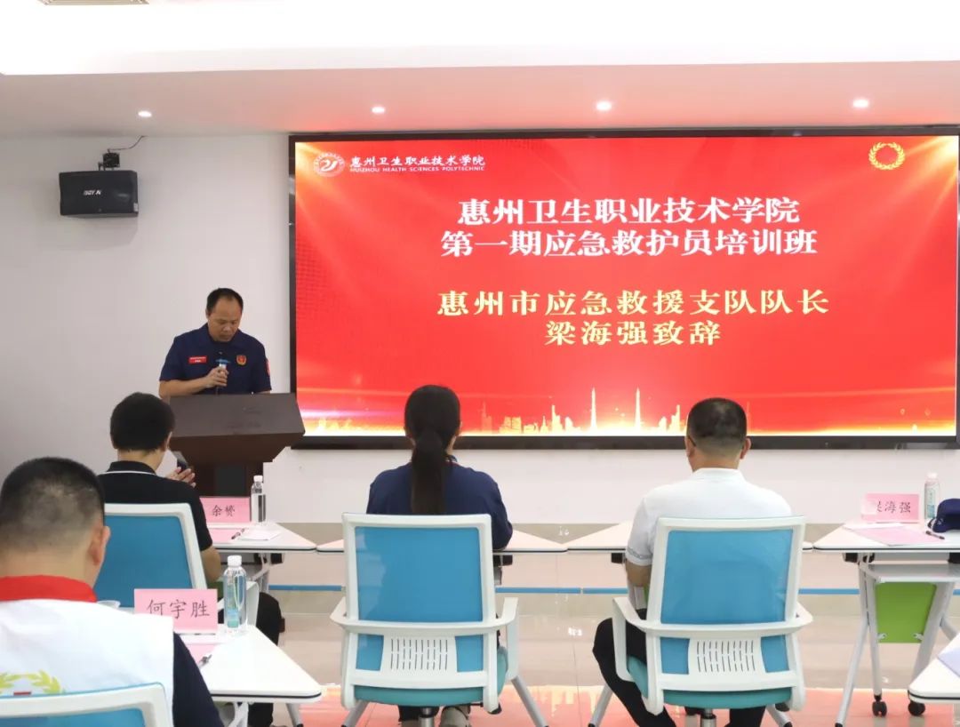 紧接着,惠州市红十字医疗救援志愿服务惠阳分队队长吴晓萍老师致辞,她肯定了对学校急救知识和技能提升的积极作为,红十字会将对本次培训给予全力支持与专业指导。惠州市应急救援支队队长梁海强上台发言,表达了对本次开班培训的希望与憧憬,更加坚定了学员们将今日之所学化为明日之所能的信心。
