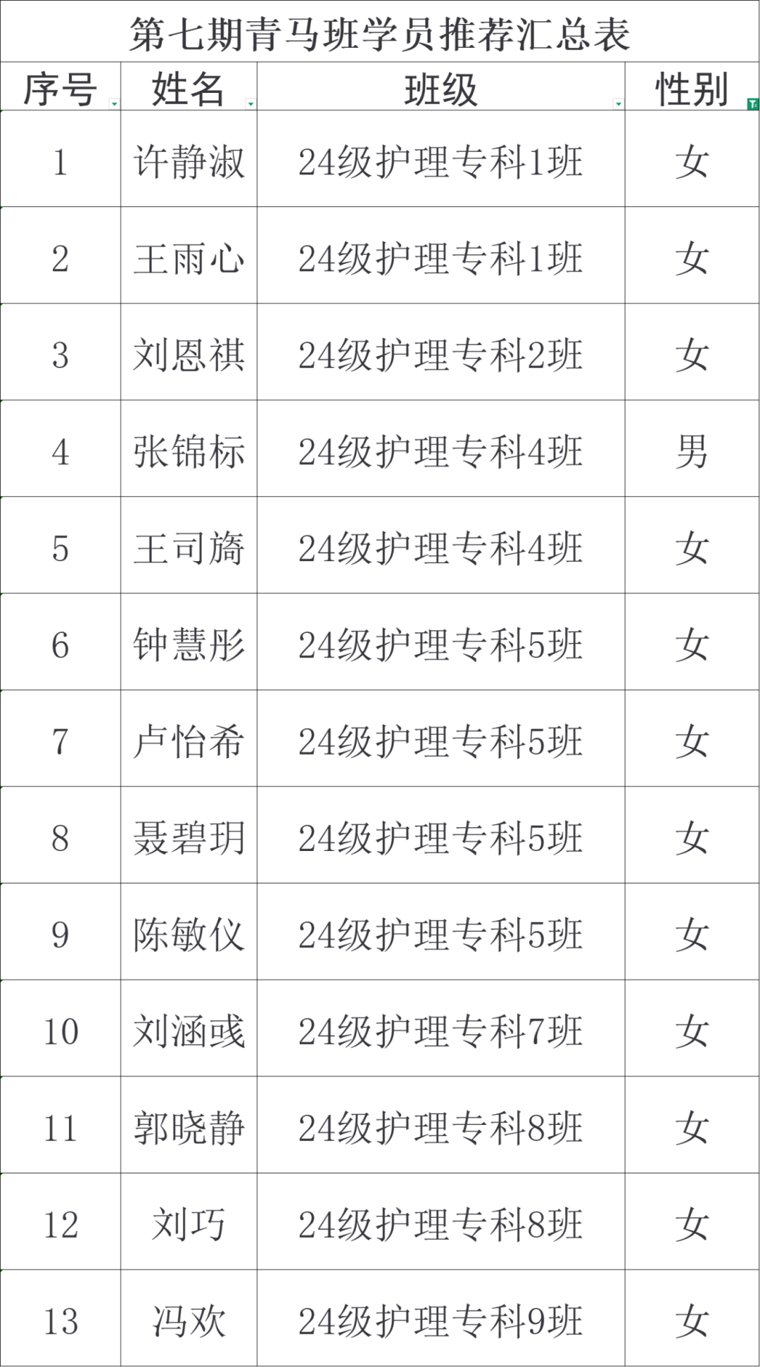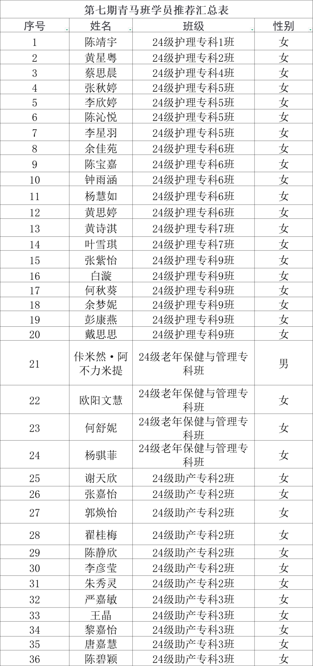 为深入推进学习贯彻习近平新时代中国特色社会主义思想主题教育,推动习近平新时代中国特色社会主义思想和党的二十大精神在广大团员青年中走深走实,进一步加强对青年大学生的思想政治引领,着力为党培养和输送青年政治骨干,校团委决定举办2025—2026学年校级“青年马克思主义者培养工程”培训班,简称“青马班”。经学生主动申请,班级择优推荐,学院团委审核,拟报2024级护理专科1班陈靖宇等49名同学为第七期青马班学员,呈学校团委二次审核。