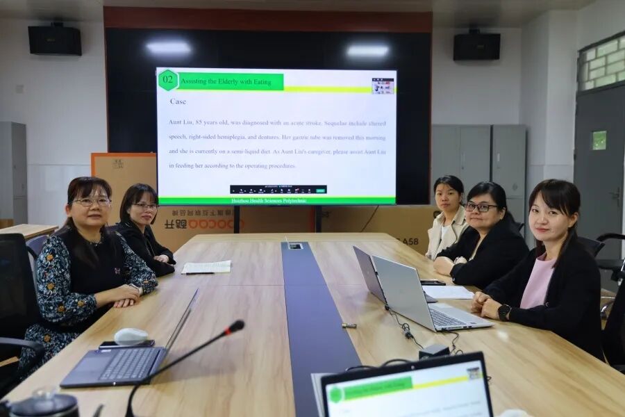 10 月 20 日下午 17:00,为确保线上培训顺利开展,项目团队在护理实训楼 201 会议室参加由中介机构组织的 Classin 培训软件使用教程线上培训,提前熟悉平台操作流程,为培训技术保障做好充分准备。10 月 27 日至 28 日,6 场线上培训如期举行,培训内容聚焦老年保健与管理核心领域,精准覆盖非语言沟通、老年人平衡膳食与一日饮食安排、老年健康管理、老年人饮食照护技术、老年人康复保健技术及老年人自理能力评估实务等关键知识点,完美匹配摩洛哥老年保健与管理专业标准输出需求。