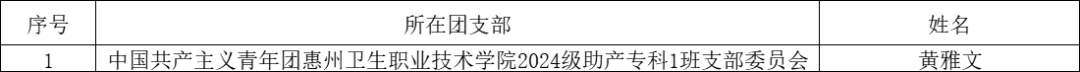 护理学院|关于2025下半年共青团员拟发展对象补充名单公示 时间:2025-12-22 作者: 游览: 字号:小中大 为深入贯彻落实习近平总书记关于加强新时代团员队伍先进性建设的重要指示,充分调动广大青年积极性,增强团组织的战斗力和凝聚力,加强团员队伍先进性建设,根据《关于做好2025年惠州市直学校发展团员调控工作的通知》等文件精神,按照学校《关于开展惠州卫生职业技术学院2025年团员发展工作的通知》要求,现将护理学院2025下半年共青团员拟发展对象补充名单予以公示。