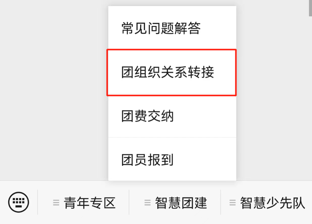1.关注“广东共青团”或“12355青年之声”微信公众号,在公众号菜单栏点击“智慧团建”-“团组织关系转接”,进入首页。