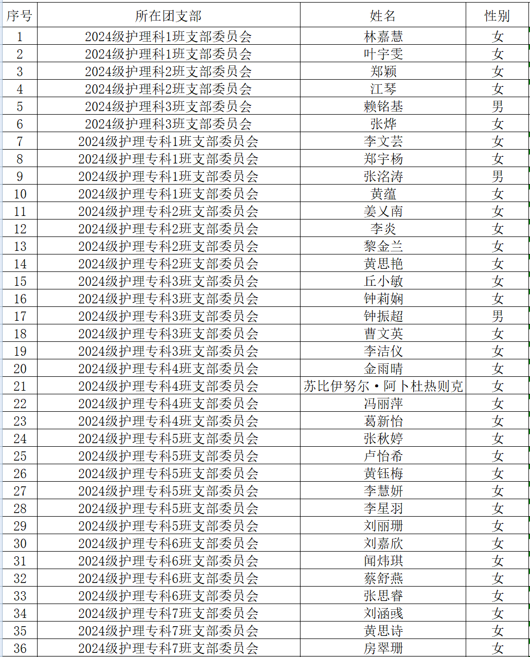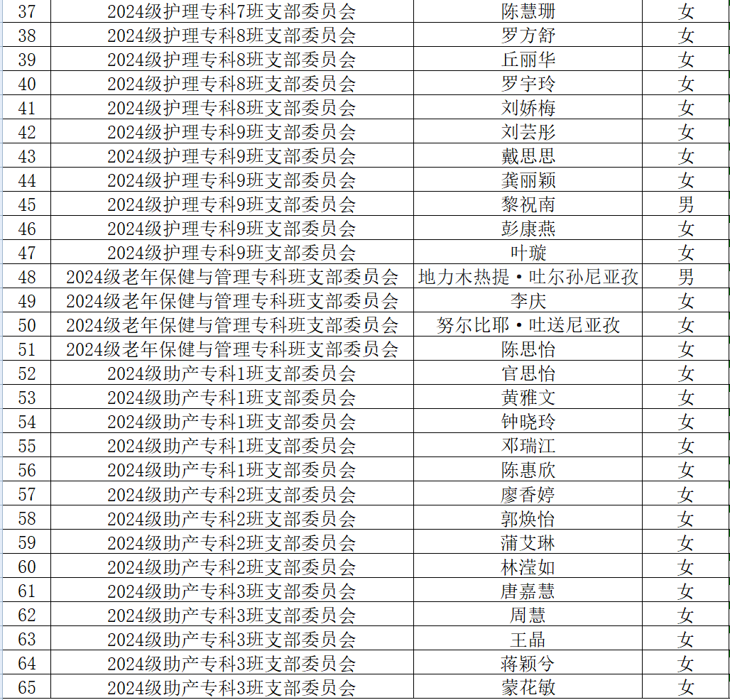 为深入贯彻习近平总书记关于青年工作指示批示精神,充分调动广大青年积极性,增强团组织的战斗力和凝聚力,加强团员队伍先进性建设,根据《中国共产主义青年团章程》等文件要求和学校团委的工作部署,经征求各方意见,呈护理学院团委集体讨论,拟将以下同学列为2024年秋季入团积极分子,现将名单进行公示。