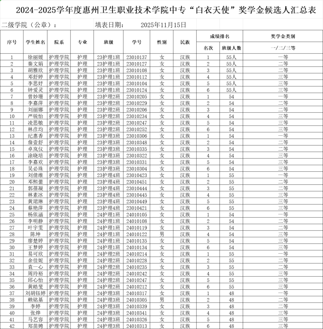 根据惠州卫生职业技术学院关于开展2024-2025学年中职校内奖学金工作的通知,通过学生本人申请,班主任、护理学院学管办公室审核,护理学院拟推荐徐丽媛等42名同学获“白衣天使”奖学金,秦文娟等6名同学获三好学生称号,徐丽媛等36名同学获优秀学生干部称号,23护理3班获文明班级称号,馨苑219等9间宿舍获文明宿舍称号”。