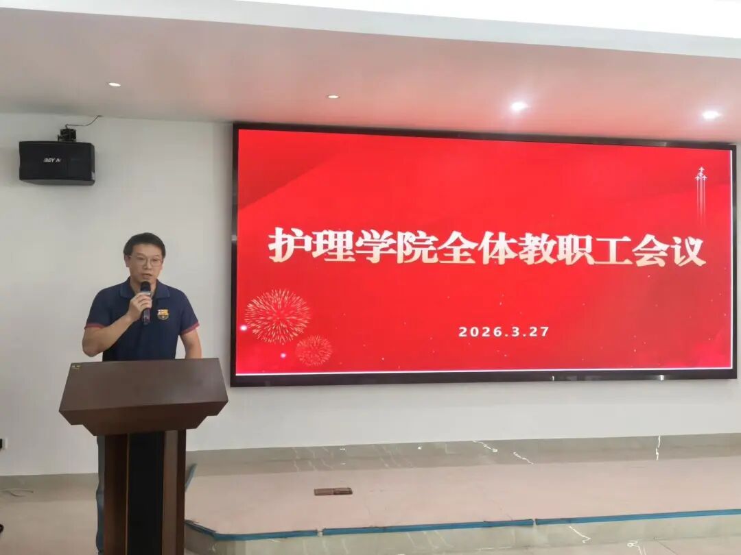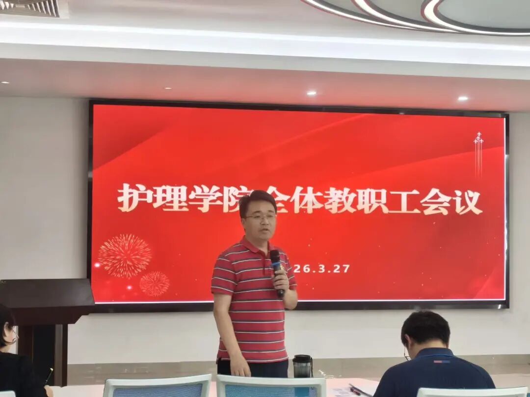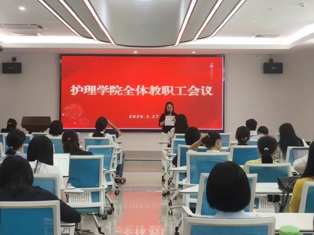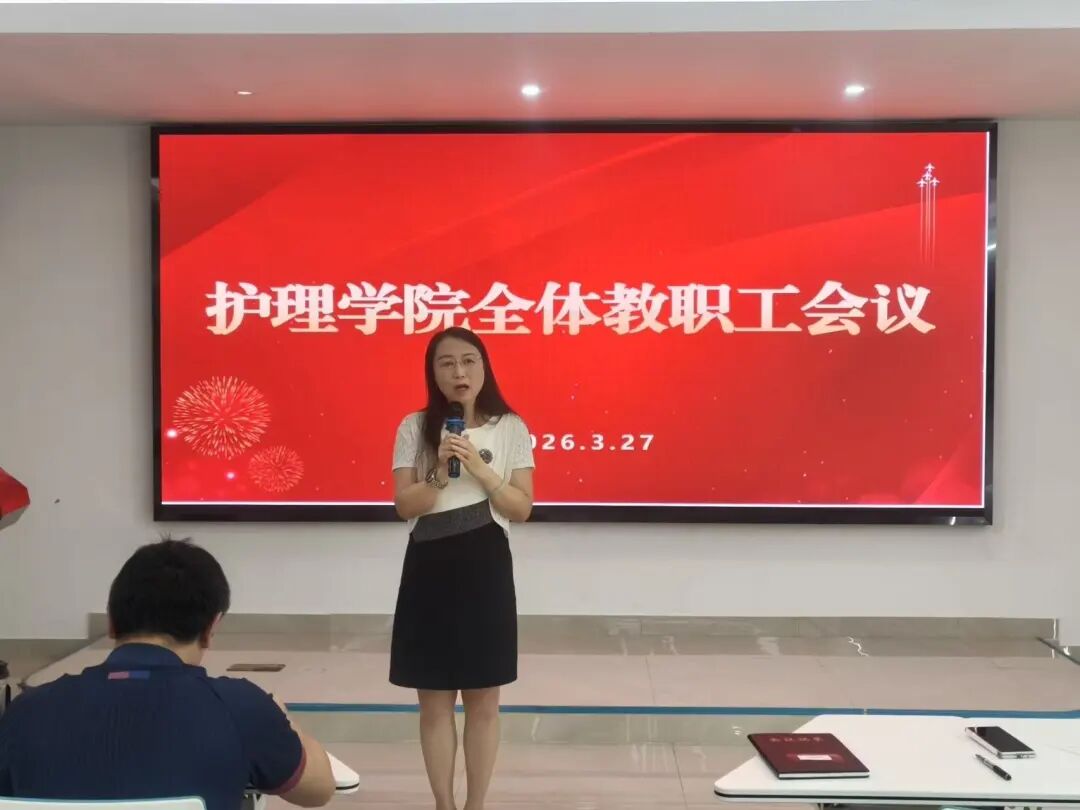 为全面总结办学成果、明晰发展方向、压实工作责任,3月27日下午15:30,护理学院在智慧养老实训中心召开全体教职工会议。会议以党建引领为核心,全面总结学院办学成果,并围绕教学提质、特色发展、社会服务等重点工作进行系统部署,压实工作责任,学院全体人员参会。