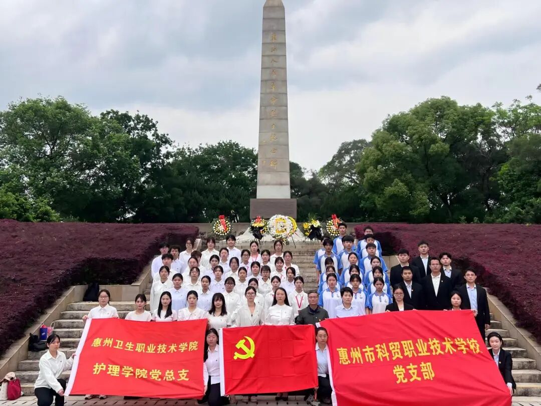 为缅怀革命先烈,传承红色基因,弘扬爱国主义精神,3月31日上午10点,惠州卫生职业技术学院护理学院党总支与惠州科贸职业技术学校党支部,在惠州东江革命纪念公园东江革命历史纪念碑联合开展清明祭英烈主题活动。惠州卫生职业技术学院护理学院党总支书记高丽玲、惠州科贸职业技术学校党支部书记温伟君,及两校党员代表、大学生入党积极分子、团员青年共同参加。
