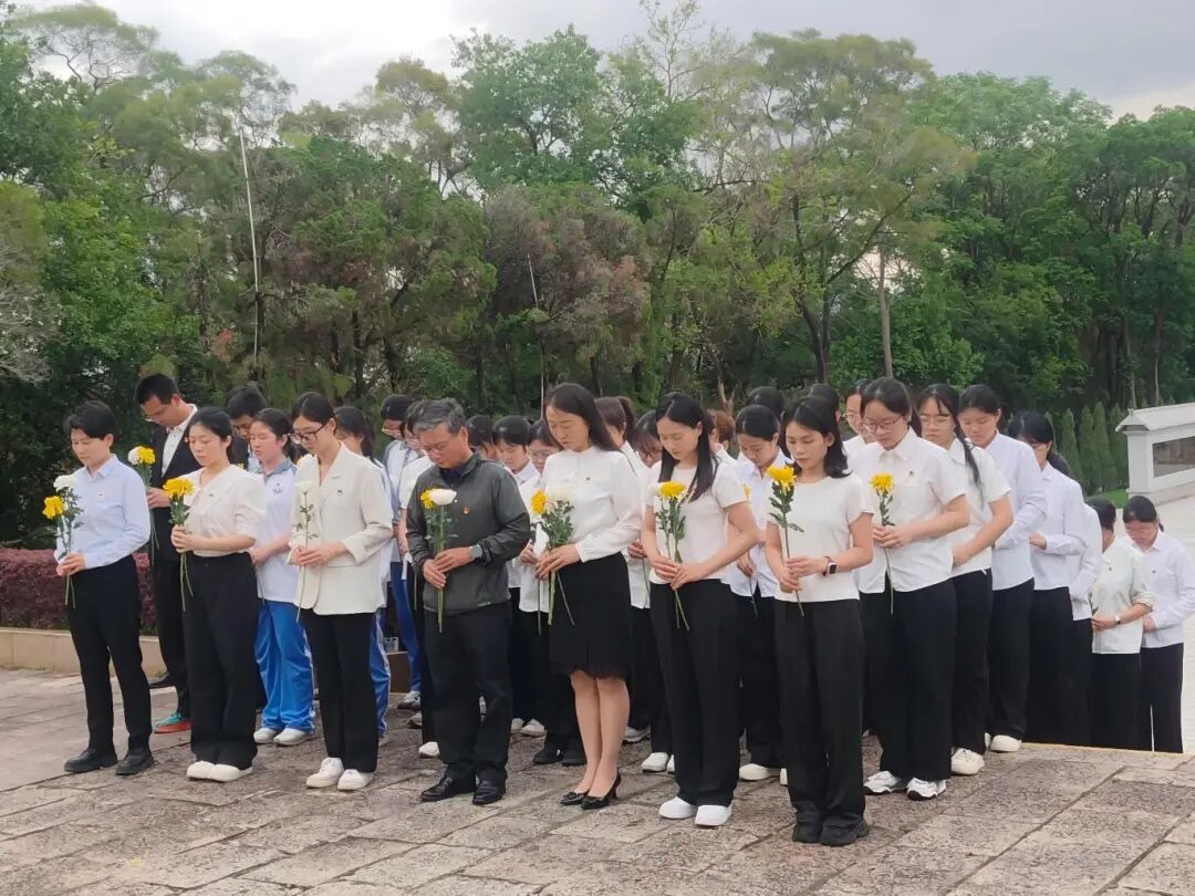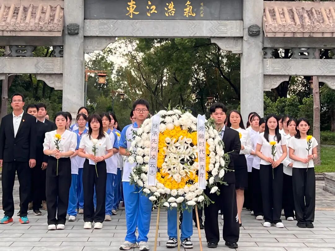 随后,高丽玲书记和温伟君书记带领师生向革命烈士纪念碑敬献花圈,整理挽联,以鲜花寄哀思,向长眠于此的革命英烈致以最诚挚的悼念。全体人员手持白菊,缓步绕行纪念碑一周,瞻仰烈士丰碑,追忆峥嵘岁月。