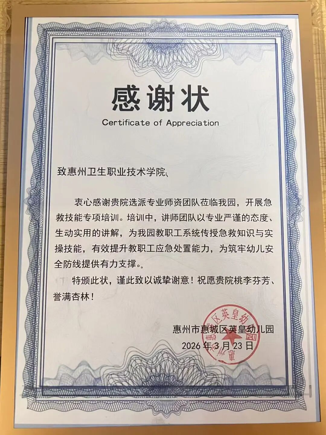 活动最后,英皇幼儿园向市急救技能宣讲团惠州卫职院分队赠送感谢信,对宣讲团专业细致、认真负责的志愿服务表示诚挚感谢。一封感谢信,既是对本次急救培训工作的充分肯定,也激励着团队继续深耕公益、服务社会。